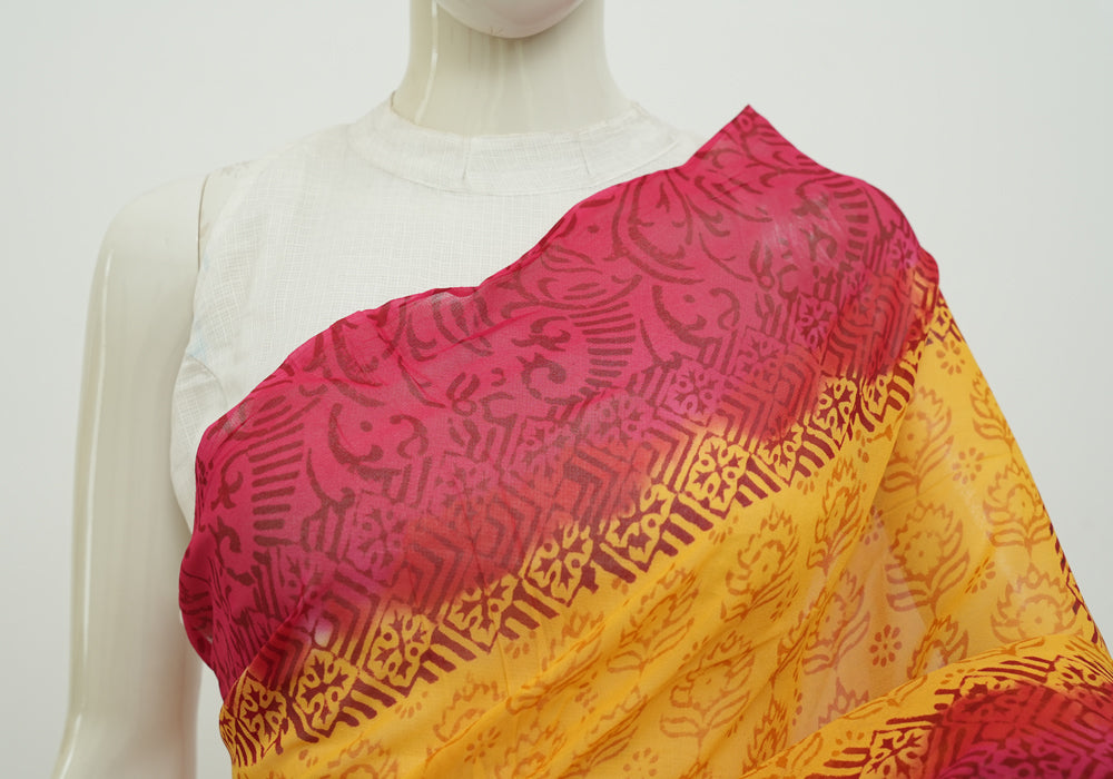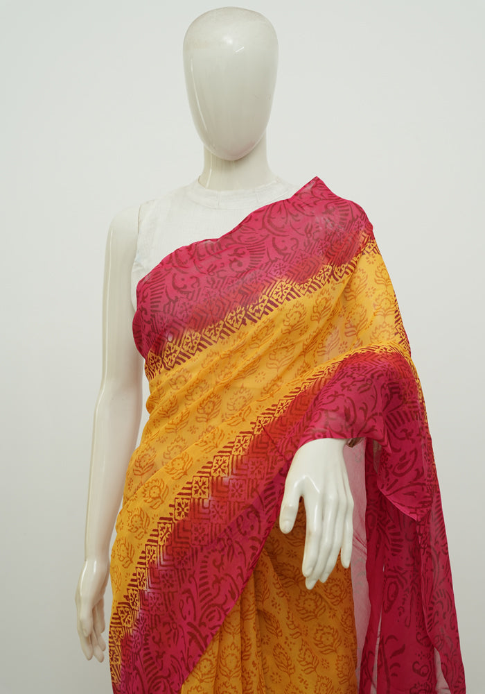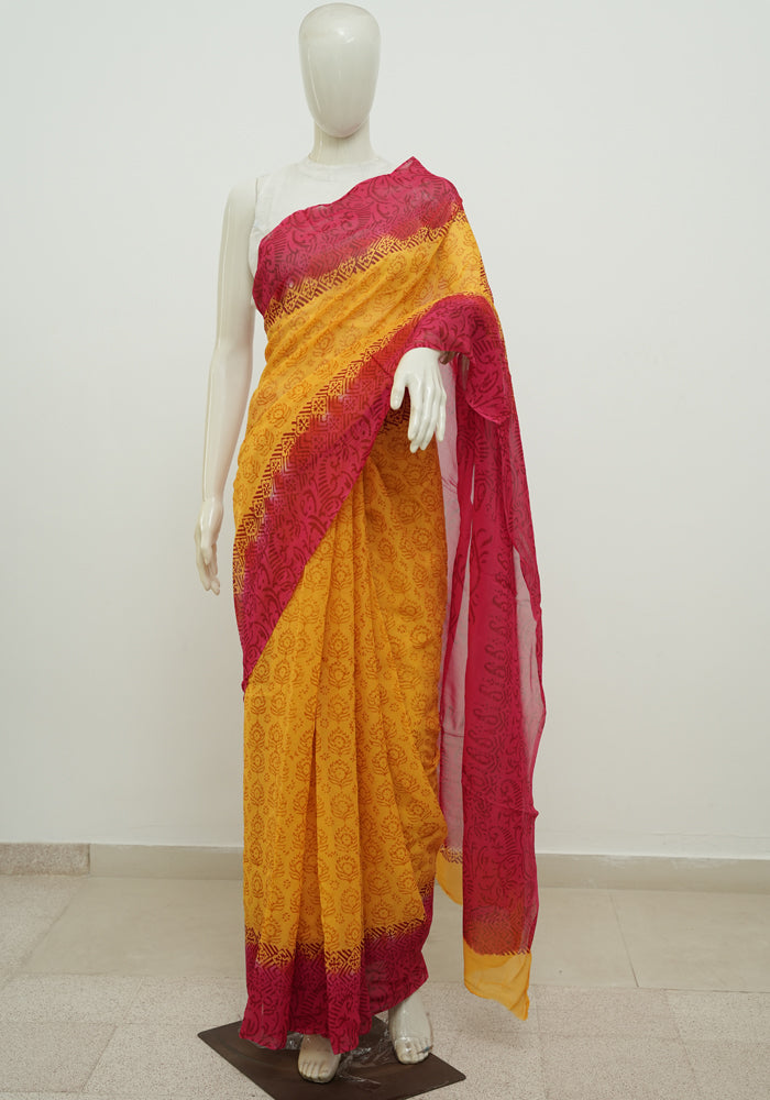 Mango Yellow and Red Block Printed Georgette Saree is OUT OF STOCK currently and available on pre-payment only. Order now for delivery within 2 weeks.