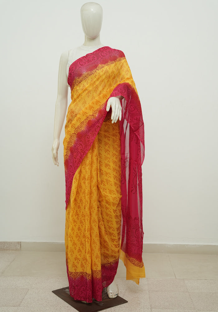 Mango Yellow and Red Block Printed Georgette Saree