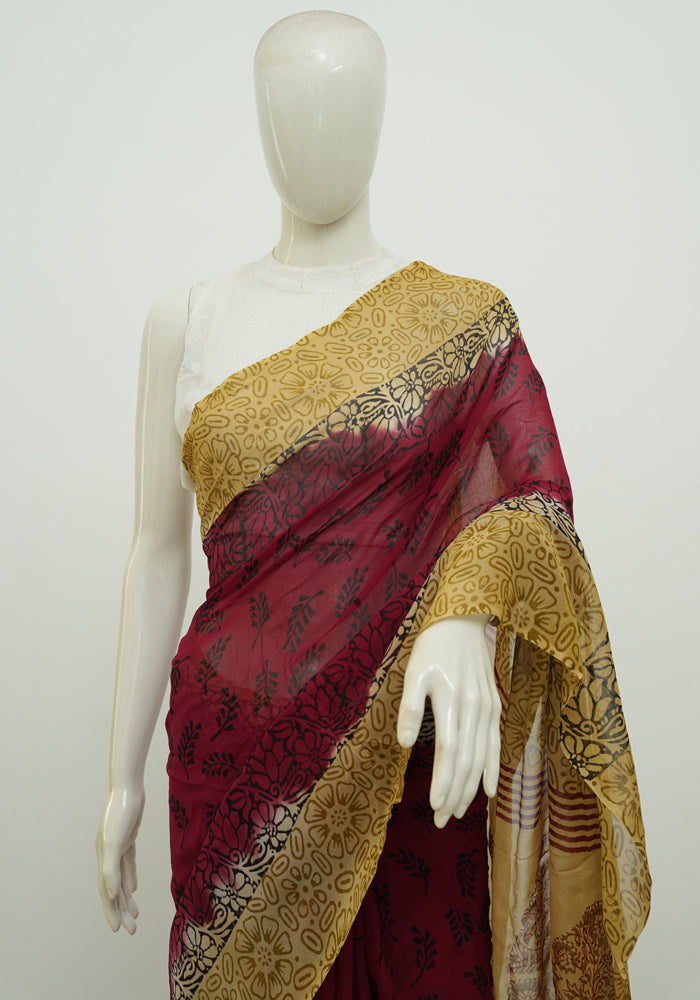Light Brown Moonga Semi Tussar Saree With Printed Kalamkari Blouse