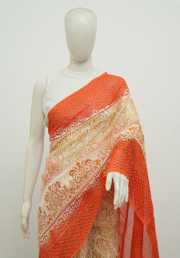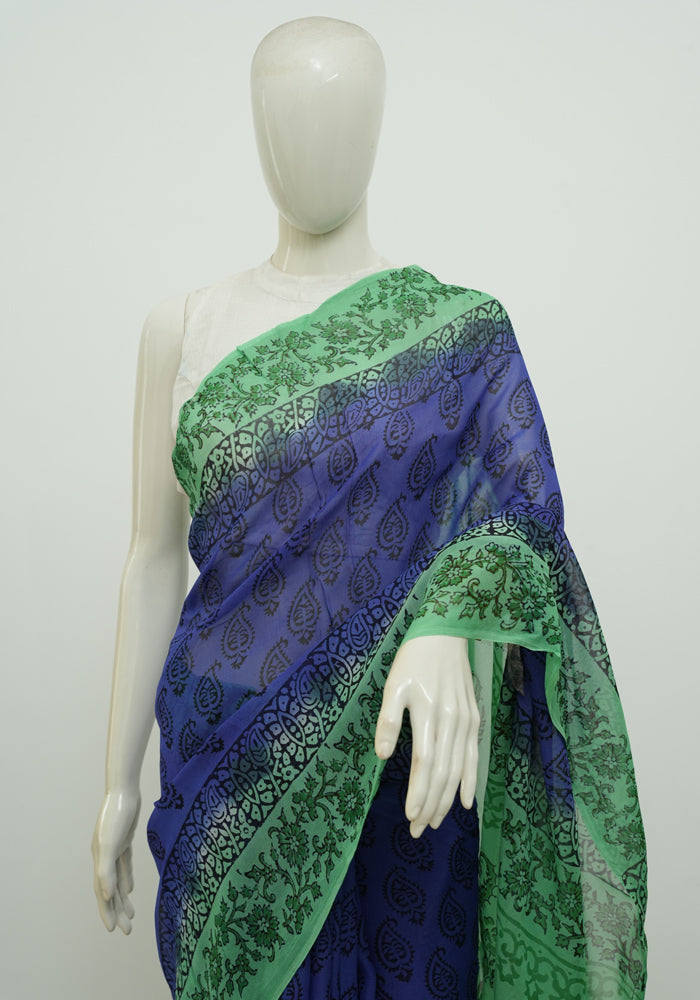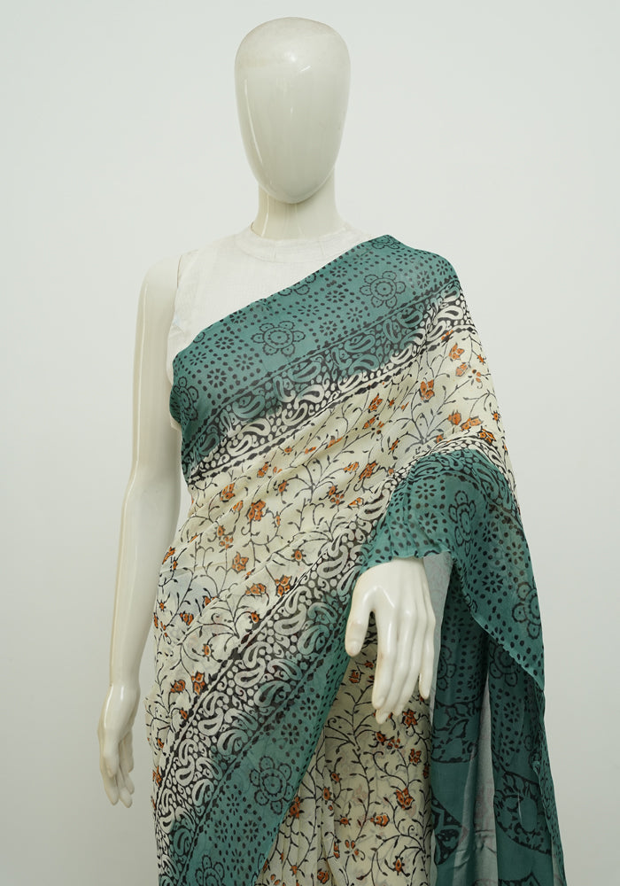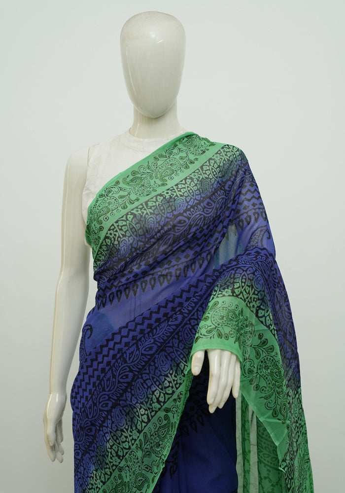 Mango Yellow and Turquoise Blue Block Printed Georgette Saree