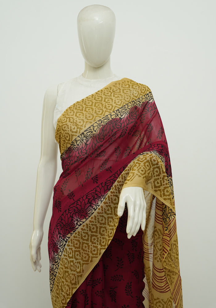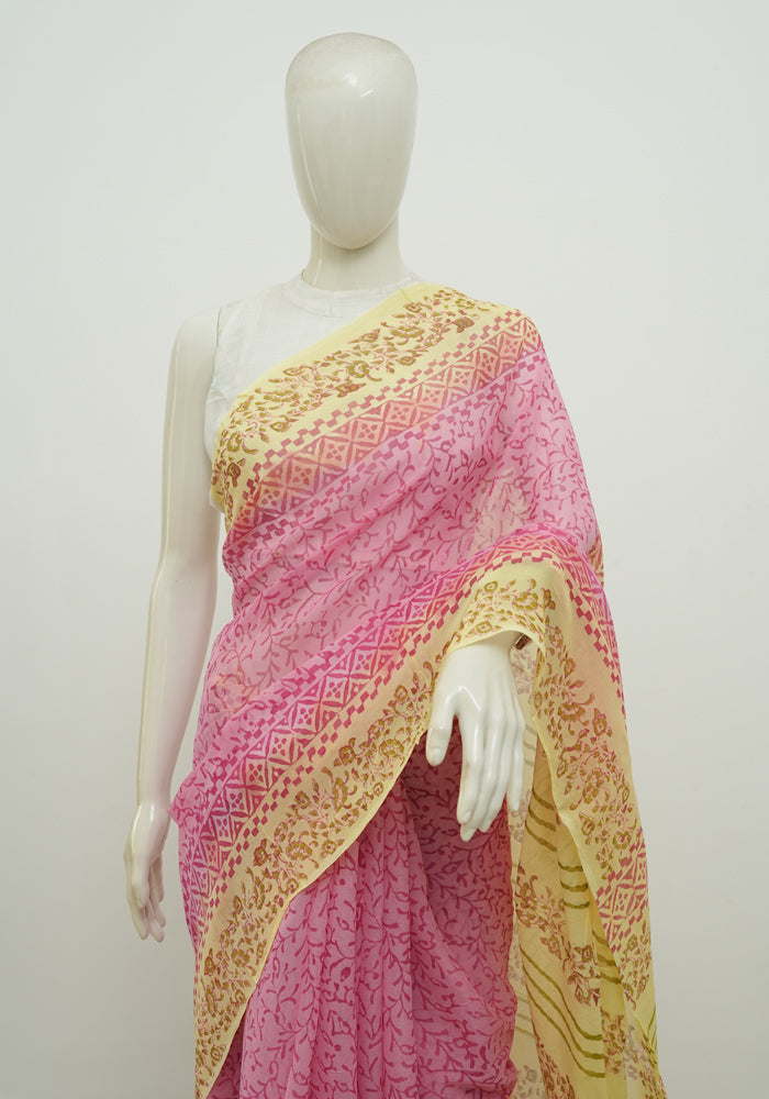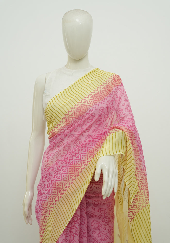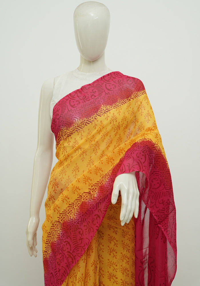Pink and Lemon Yellow Block Printed Georgette Saree