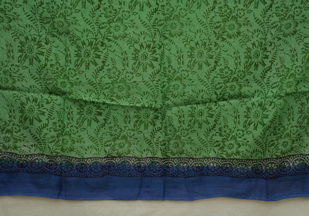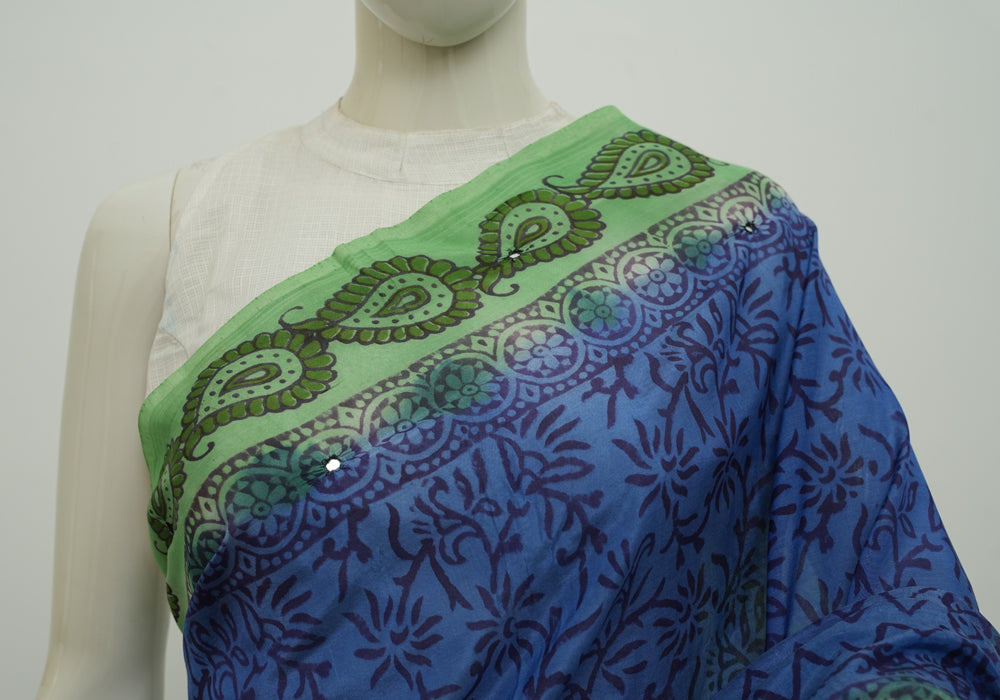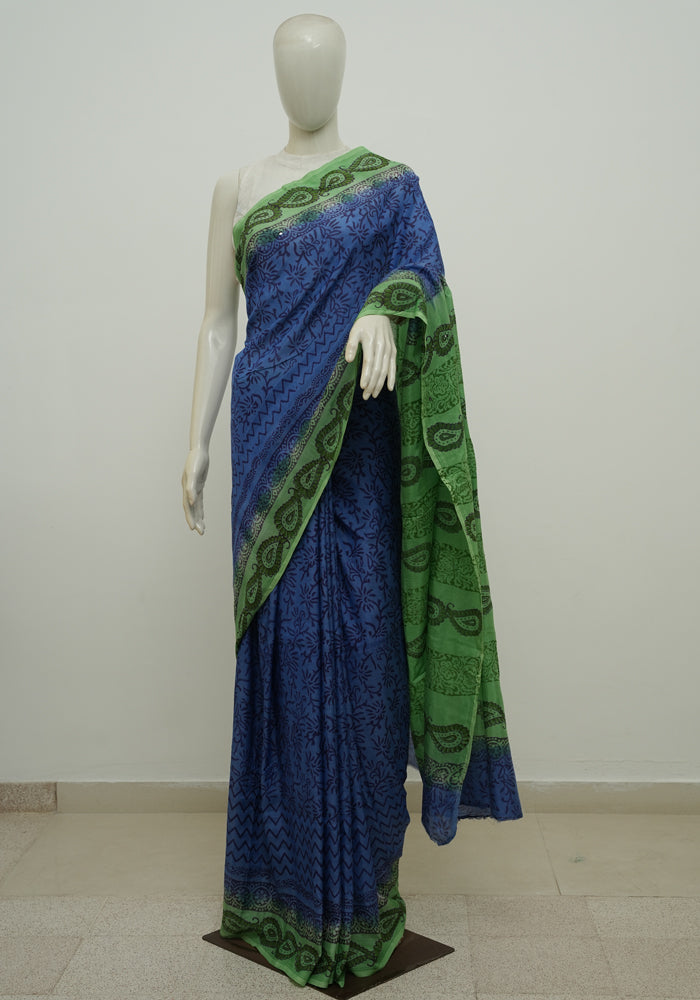 Blue and Parrot Green Block Printed Chennur Silk Saree with Mirror Work