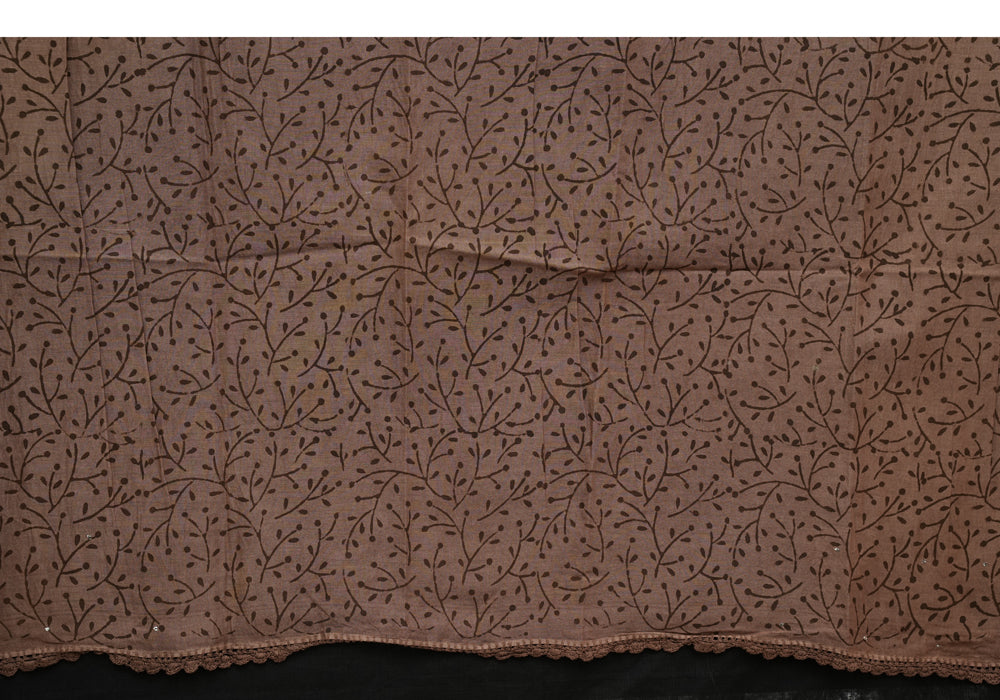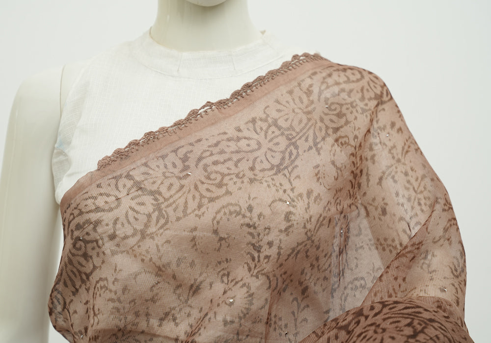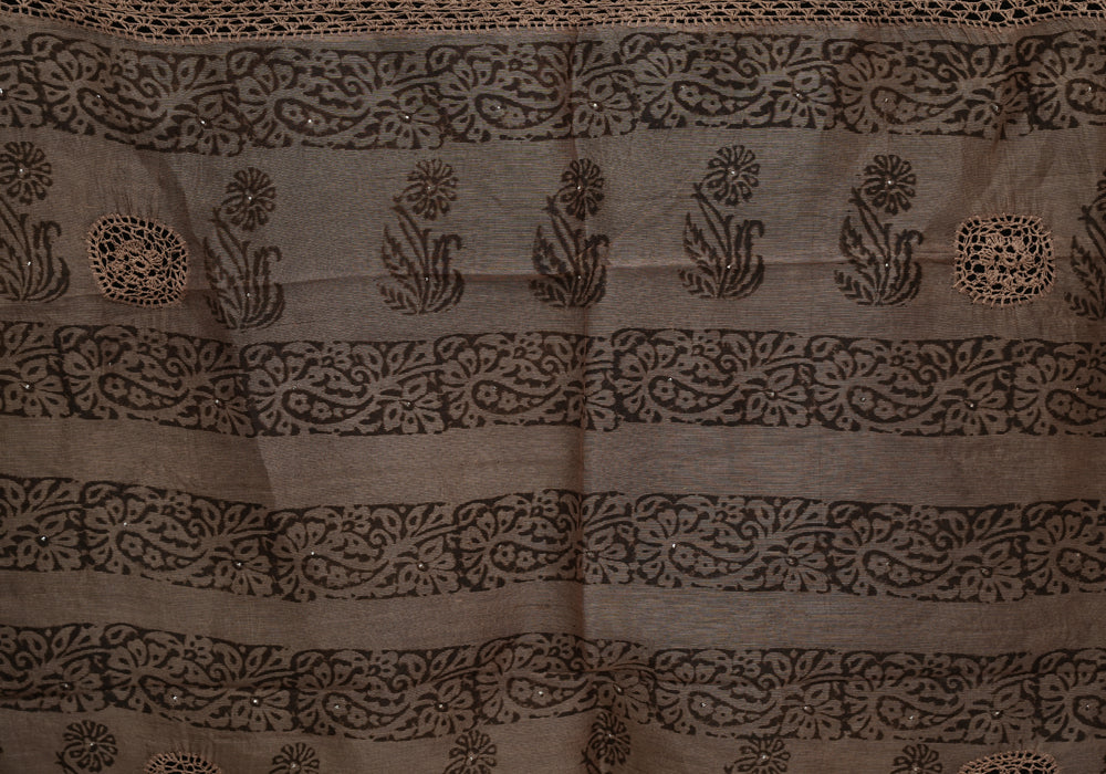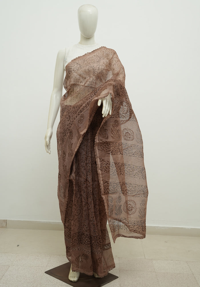 Brown Block printed Supernet Kota Saree With Crochet Work