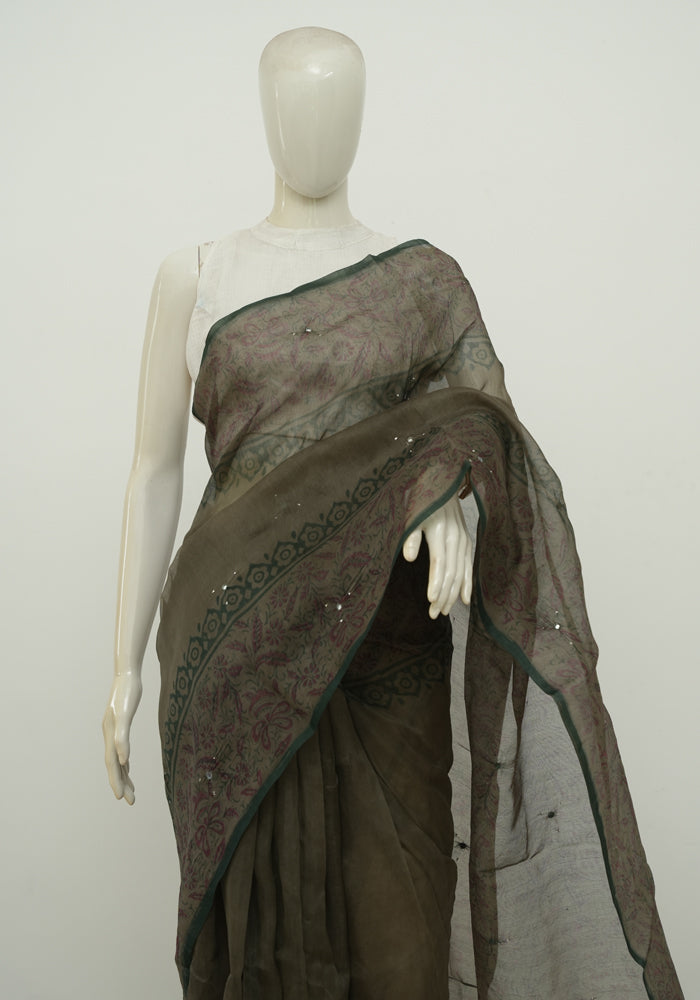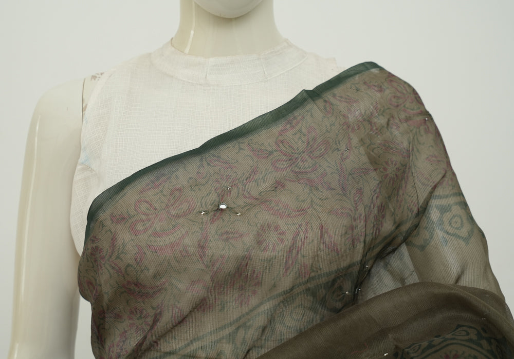 Greenish Grey Block Printed Supernet Kota saree With Mirror and Badla Work