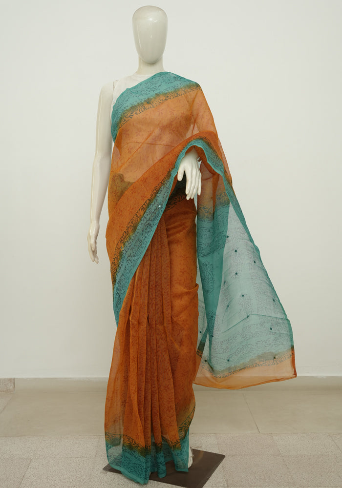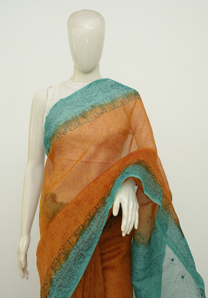 Mustard Yellow and Turquoise Green Block Printed Supernet Kota saree With Mirror Work