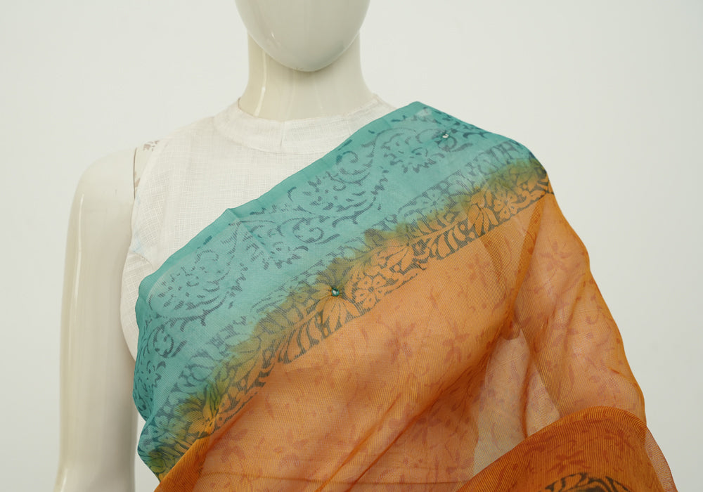 Discover the timeless elegance of hand block printed supernet Kota sarees. Soft and light weight, this supernet kota saree is perfect for dry summers and tropical weather alike. The Saree comes with Mirror work and a cotton blouse piece