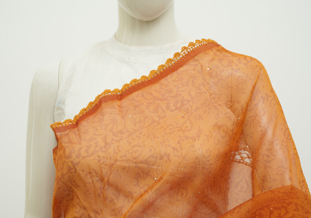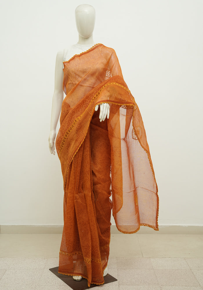 Discover the timeless elegance of hand block printed supernet Kota sarees. Soft and light weight, this supernet kota saree is perfect for dry summers and tropical weather alike. The Saree comes with Badla Work also and a Cotton Blouse