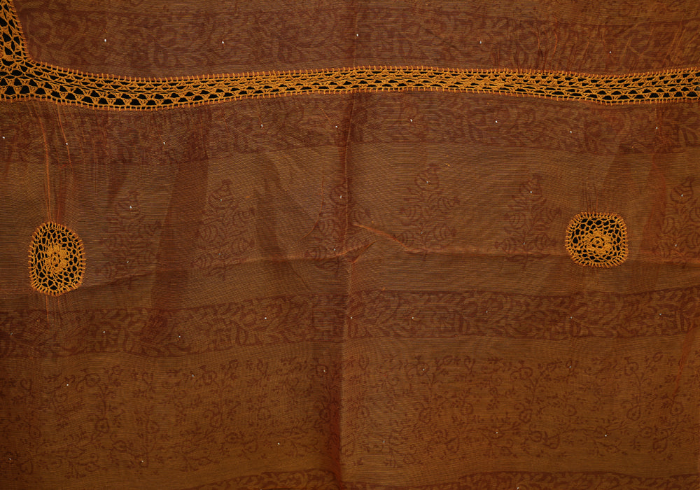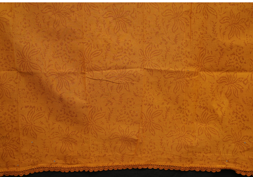 Mustard Yellow Block printed Supernet Kota Saree With Crochet Work