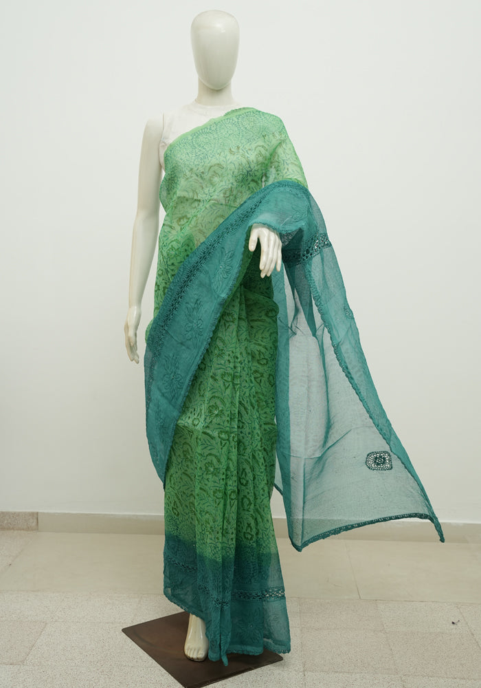 Parrot Green and Turquoise Green Block printed Supernet Kota Saree With Crochet Work