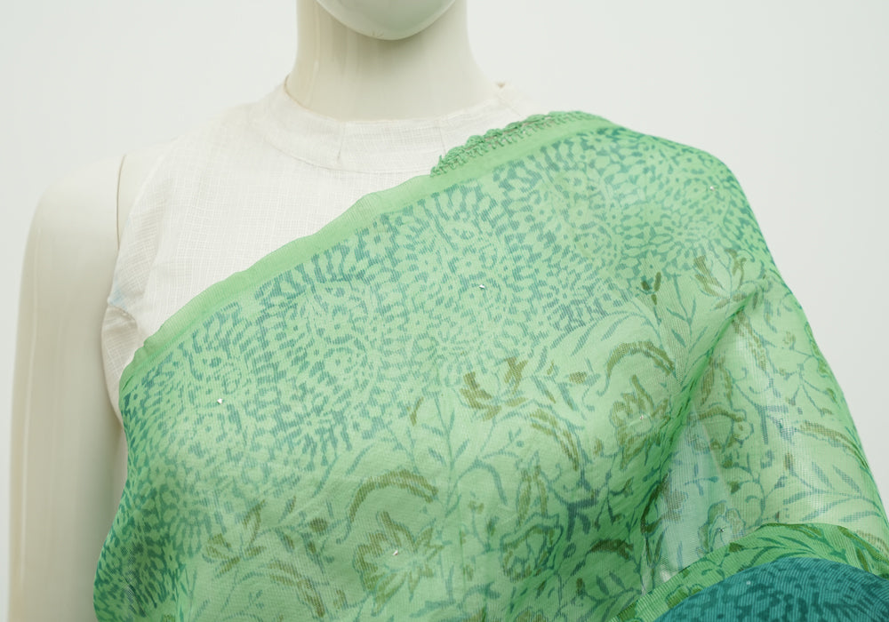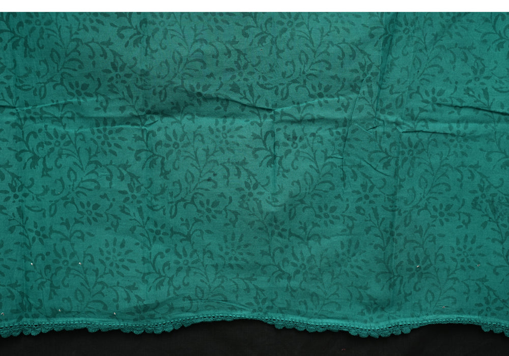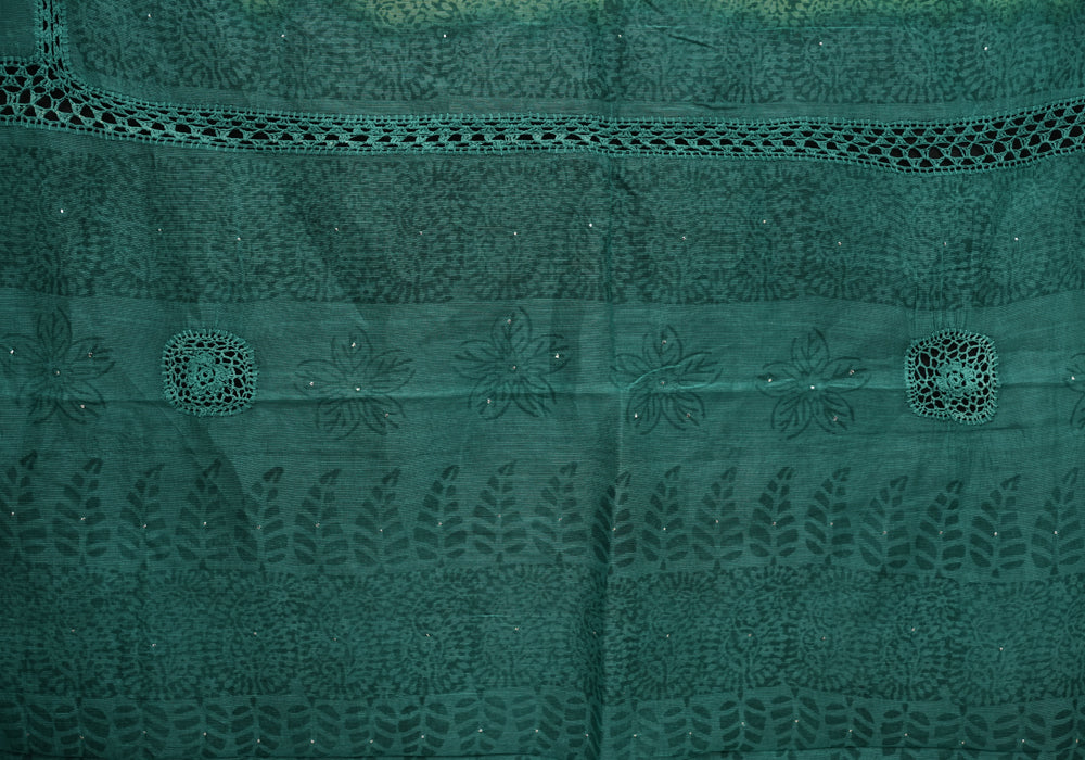 Parrot Green and Turquoise Green Block printed Supernet Kota Saree With Crochet Work is OUT OF STOCK currently and available on pre-payment only. Order now for delivery within 2 weeks.