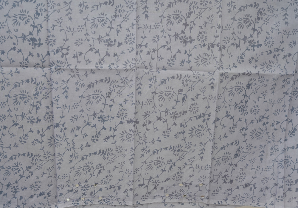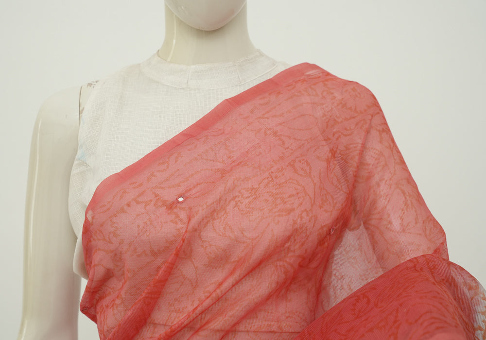 Discover the timeless elegance of hand block printed supernet Kota sarees. Soft and light weight, this supernet kota saree is perfect for dry summers and tropical weather alike. The Saree comes with Mirror work and a cotton blouse piece