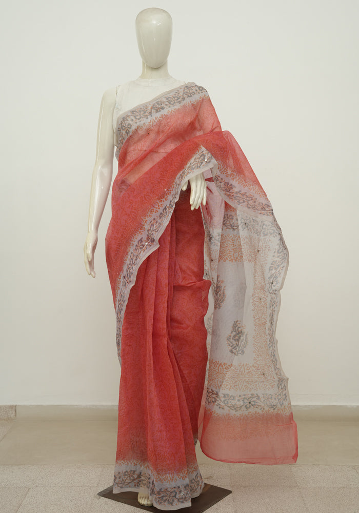 Peach and Bluish Grey Block Printed Supernet Kota saree With Mirror Work
