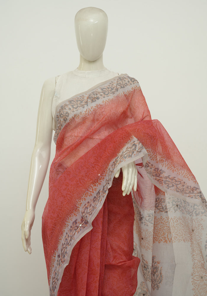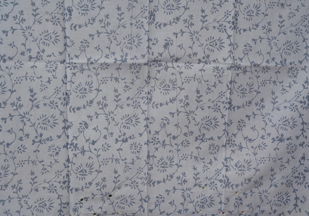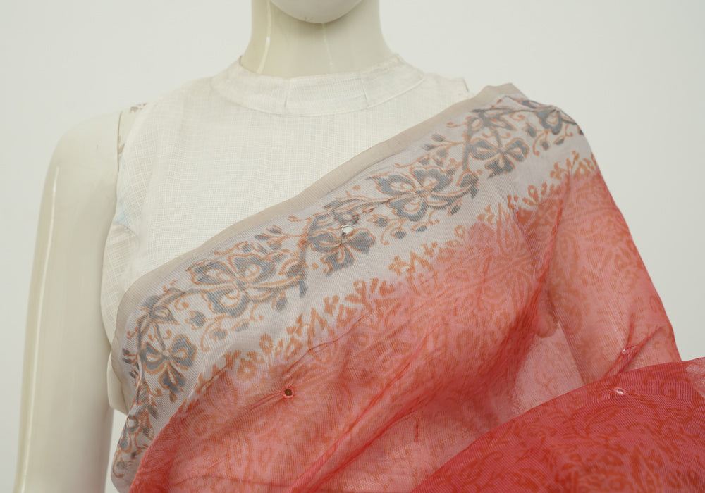 Discover the timeless elegance of hand block printed supernet Kota sarees. Soft and light weight, this supernet kota saree is perfect for dry summers and tropical weather alike. The Saree comes with Mirror work and a cotton blouse piece