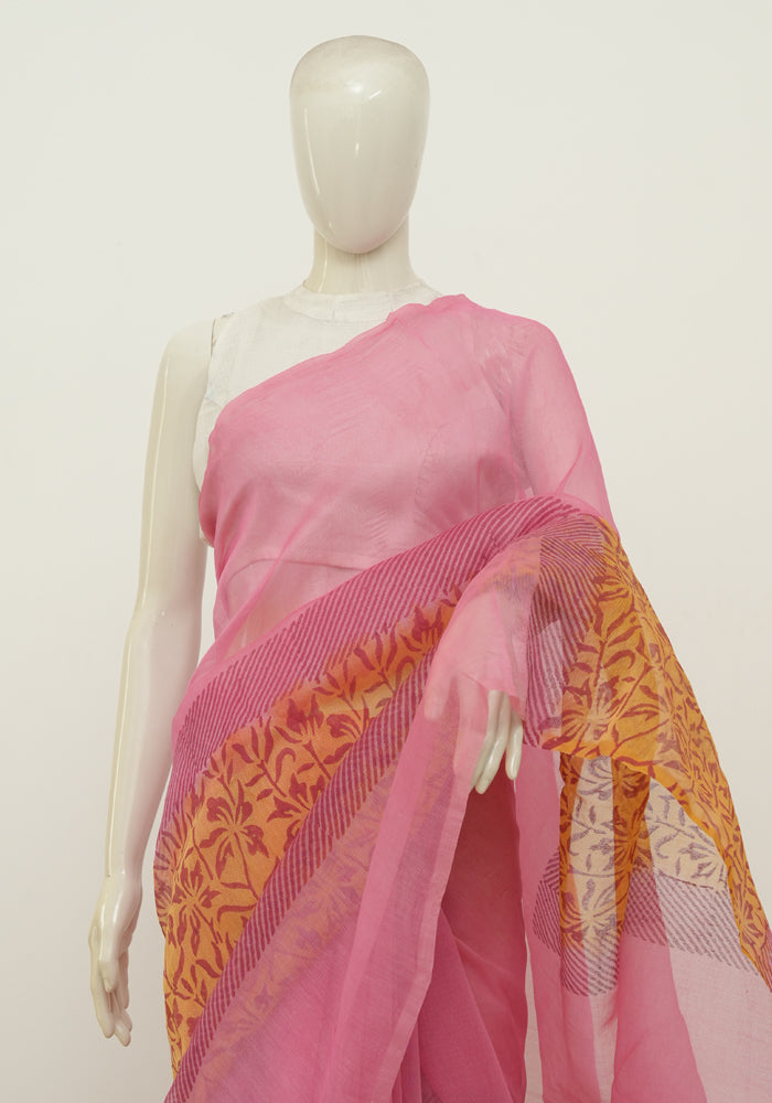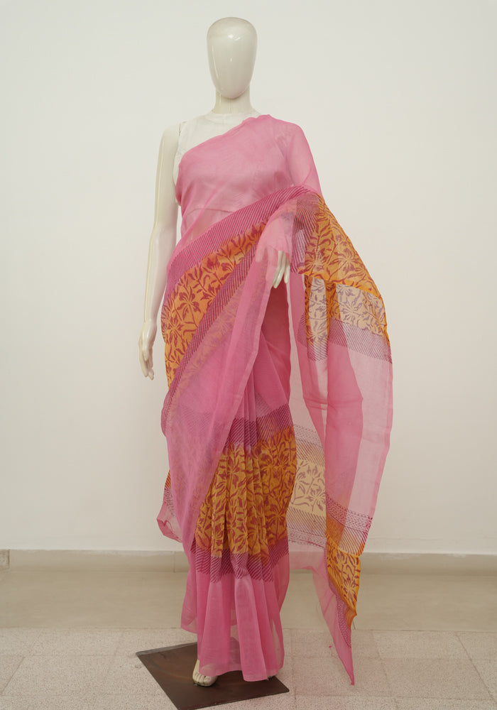 Pink and Mustard Yellow Block printed Supernet Kota Saree