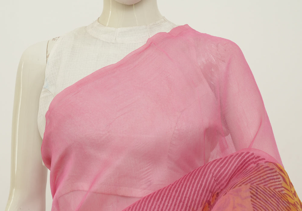 Pink and Mustard Yellow Block printed Supernet Kota Saree is OUT OF STOCK currently and available on pre-payment only. Order now for delivery within 2 weeks.
