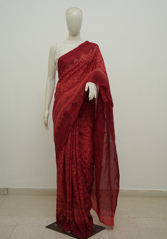 Red Block Printed Chennur Silk Saree with Mirror Work