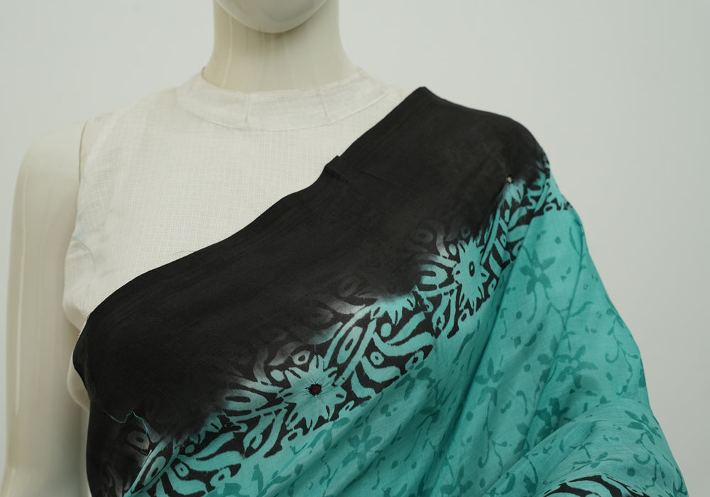 Sea Green and Black Block Printed Chennur Silk Saree with Mirror Work