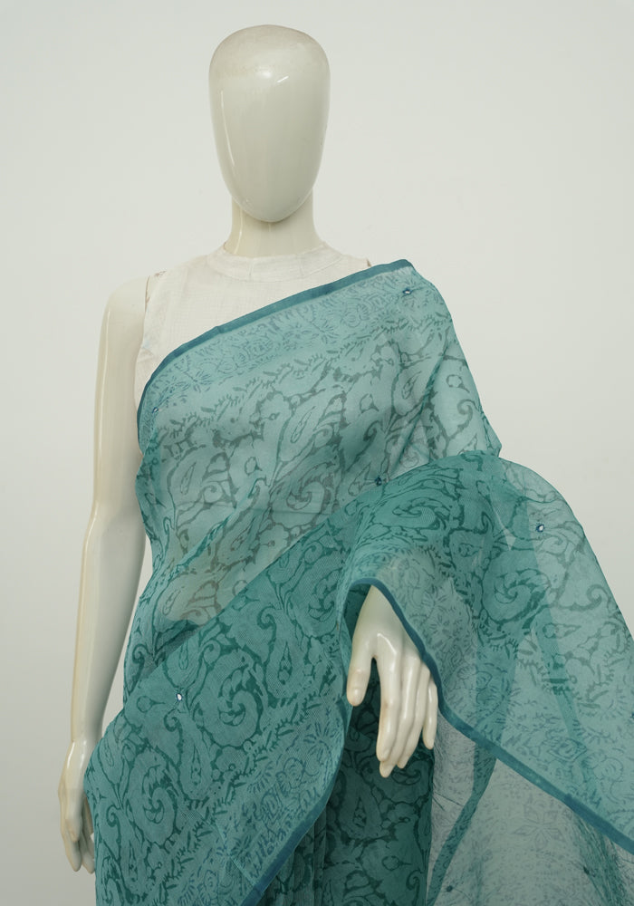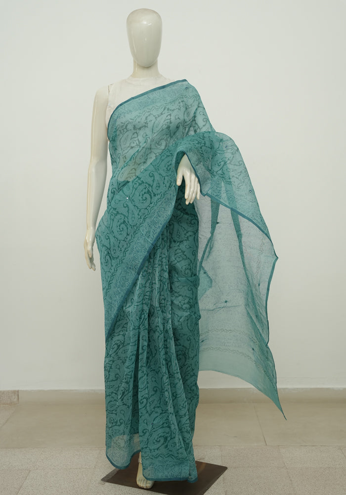 Sea Green Block Printed Supernet Kota saree With Mirror Work