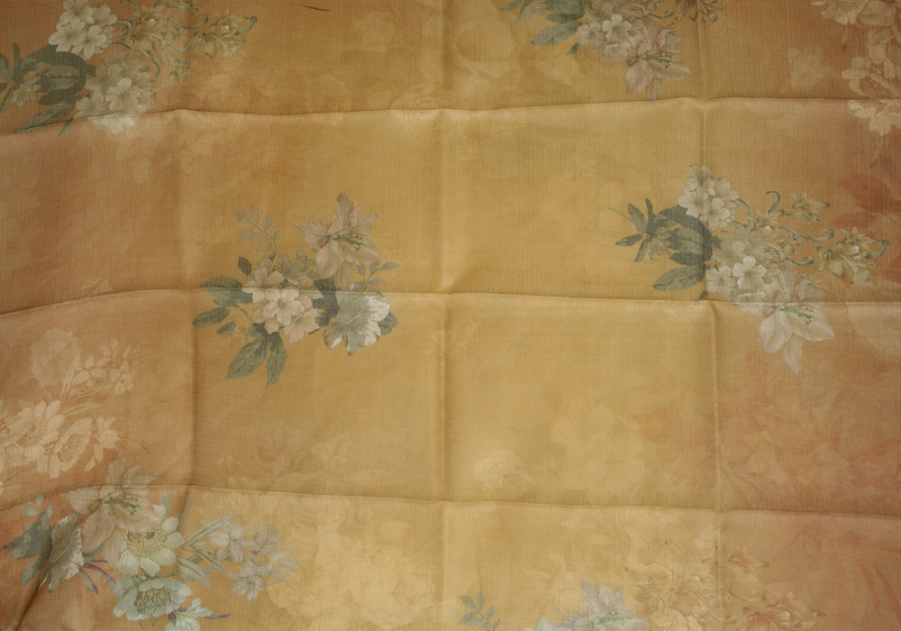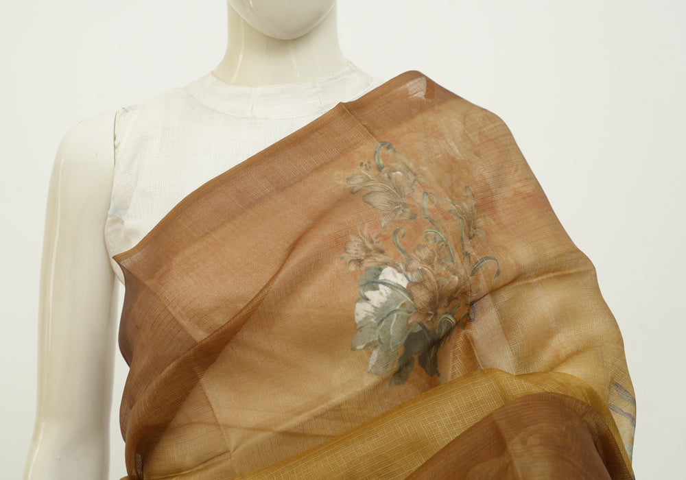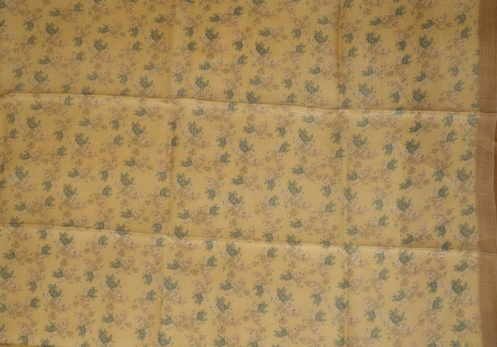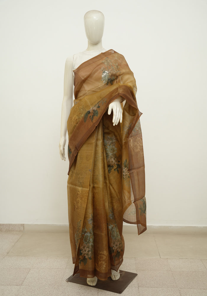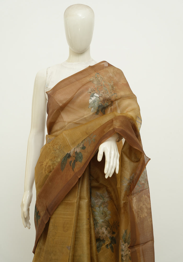Mustard Yellow and Brown Tussar Kota Saree with Digital Print