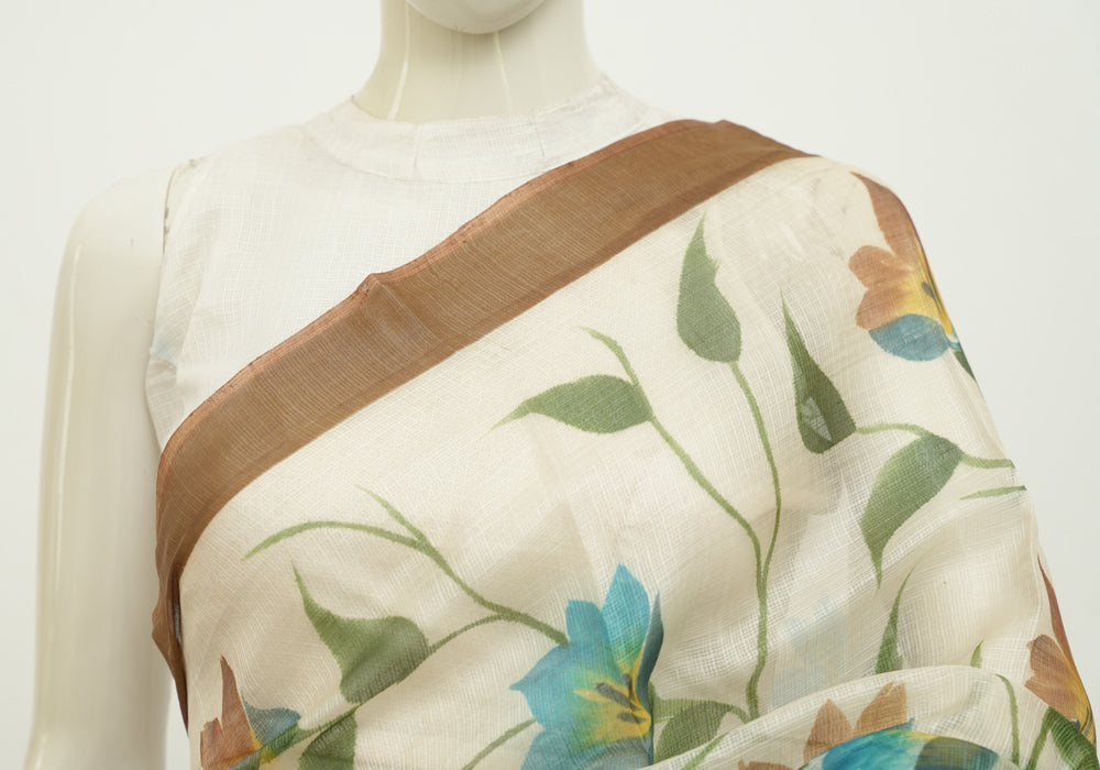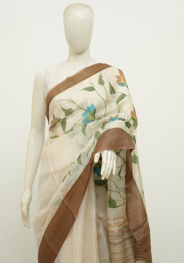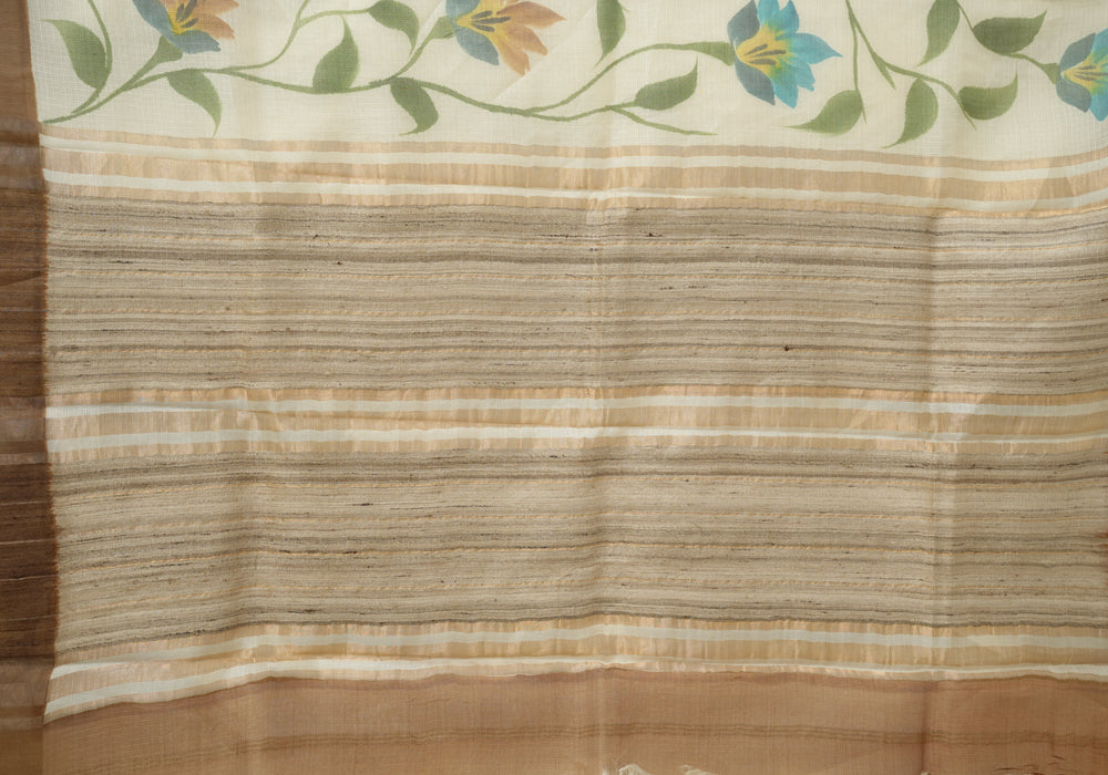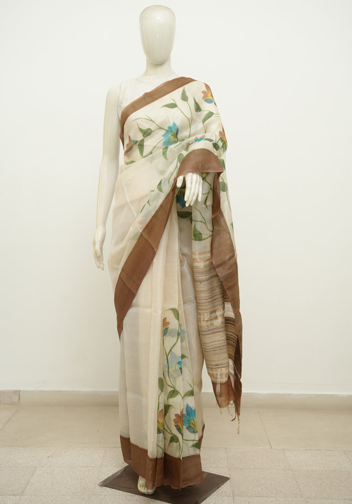 Off White and Brown Hand Painted Tussar Kota Saree With Zari Pallu