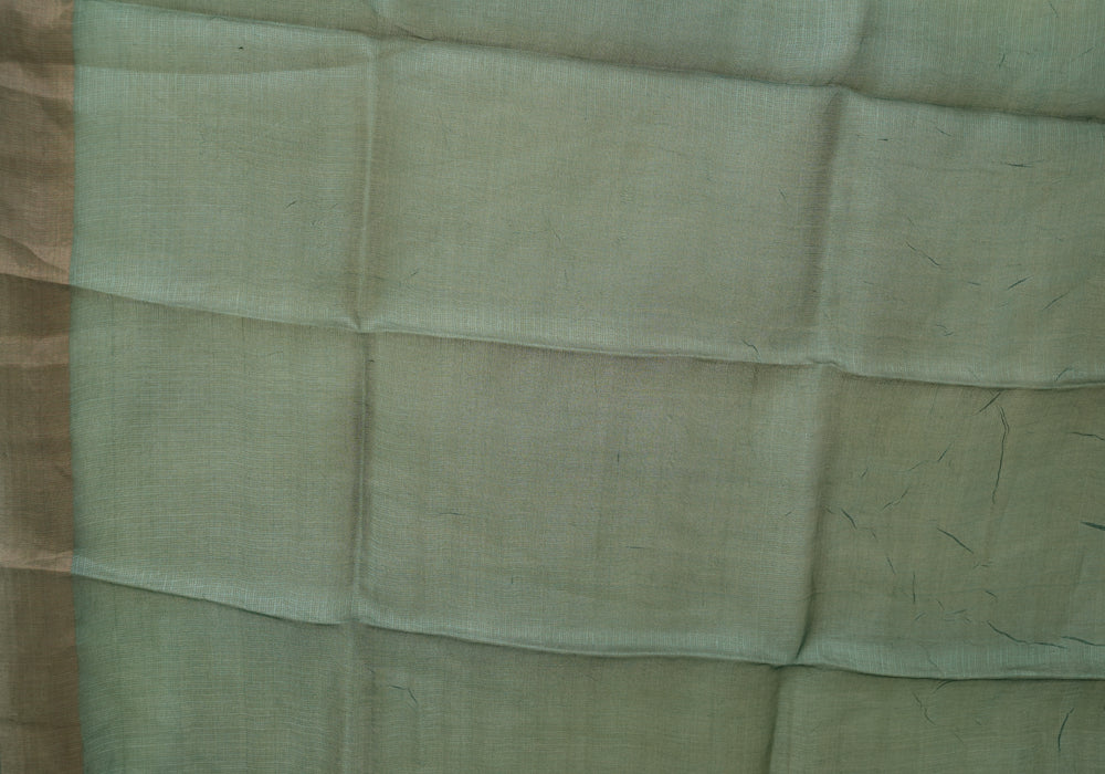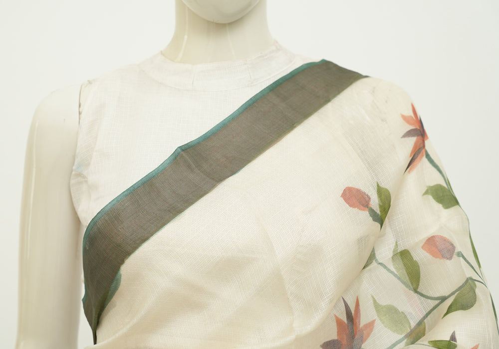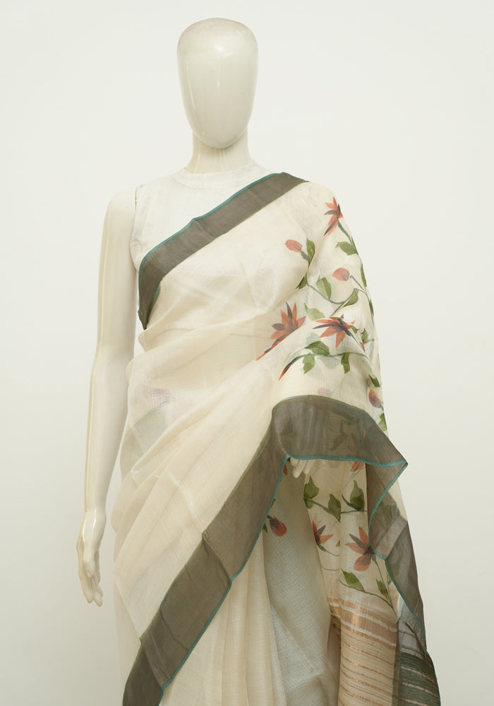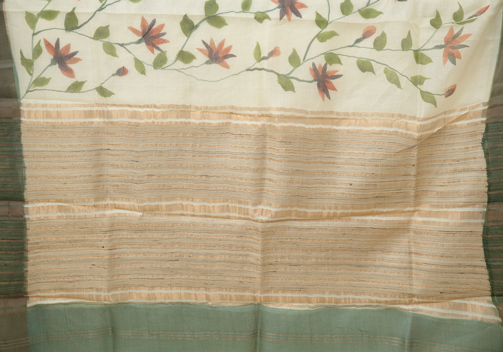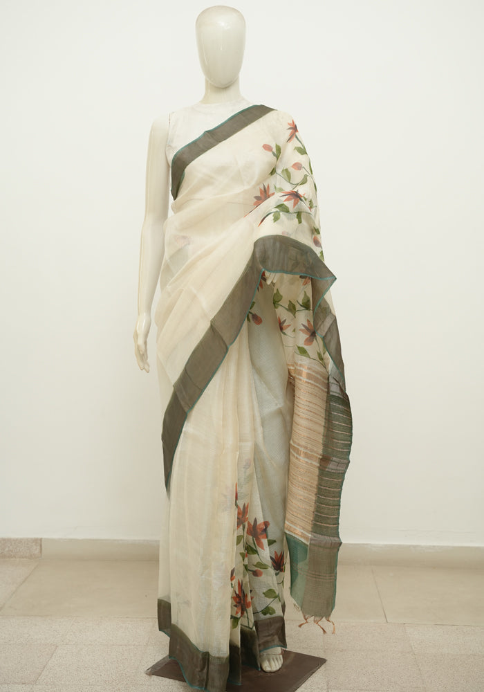 Off White and Teal Green Hand Painted Tussar Kota Saree With Zari Pallu