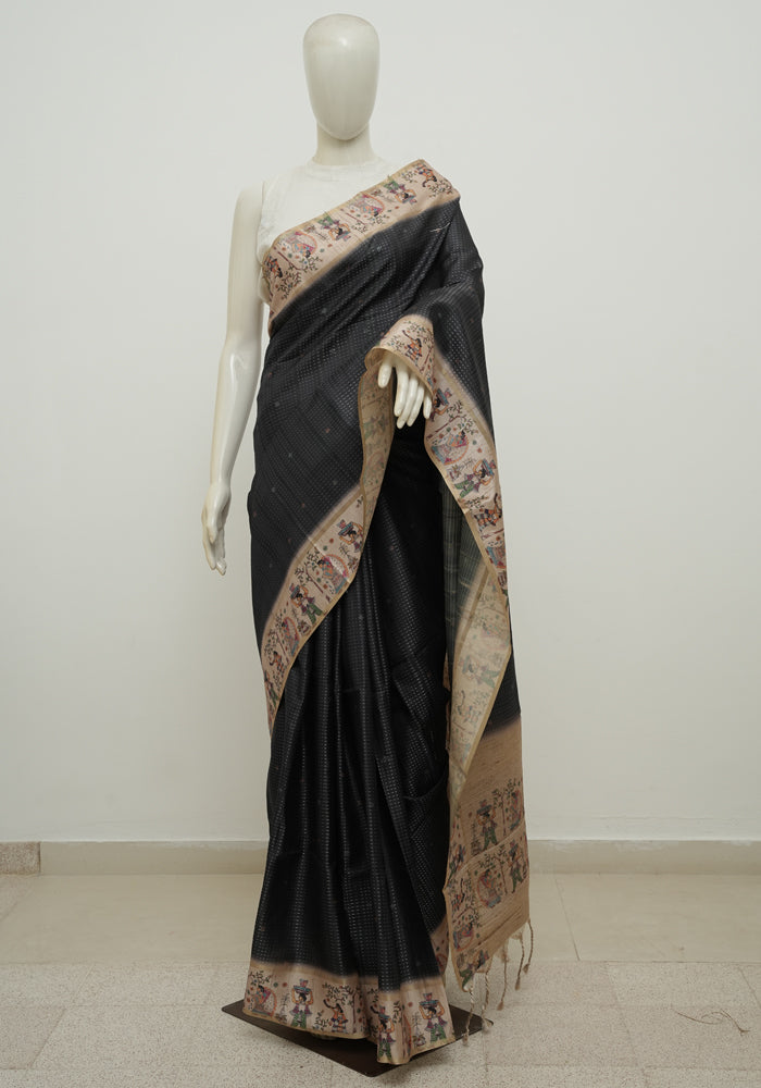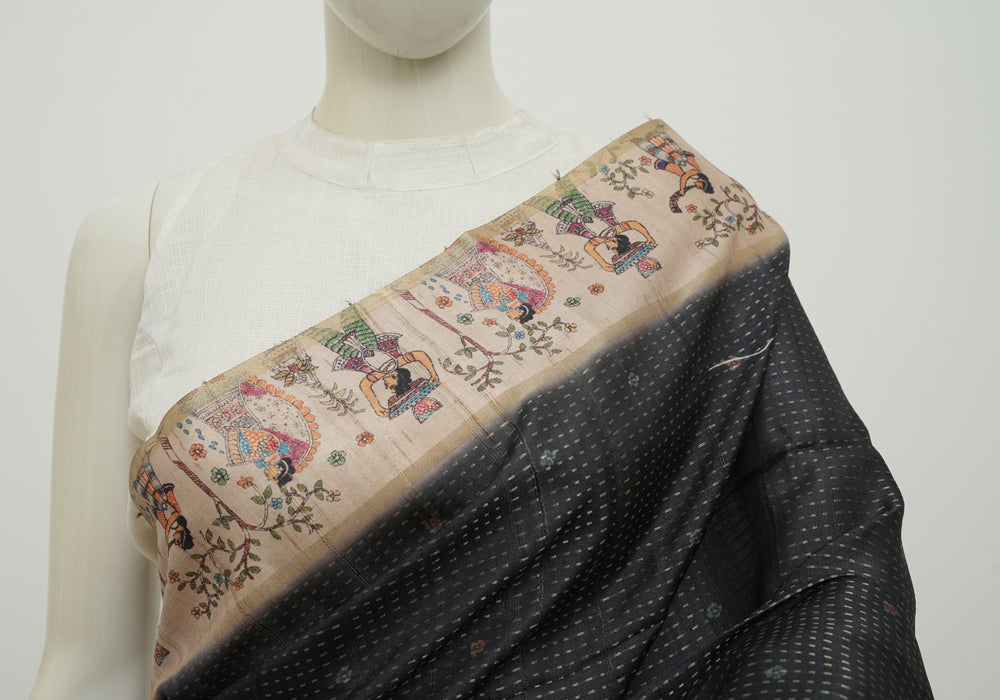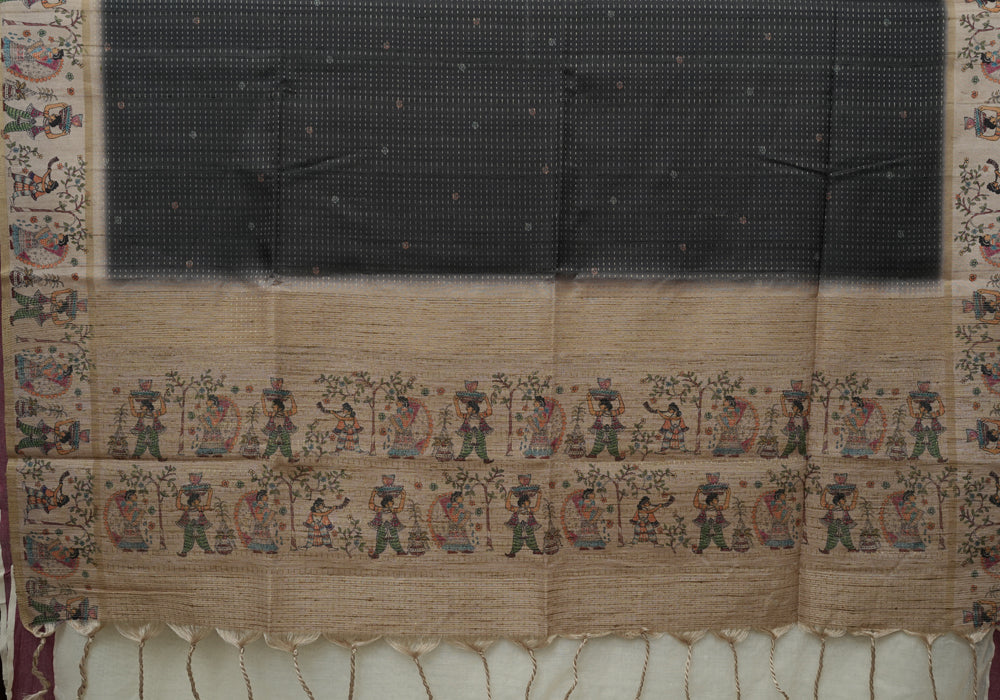 Black and Beige Semi Tussar Saree with Kanta Printed Pallu and Blouse
