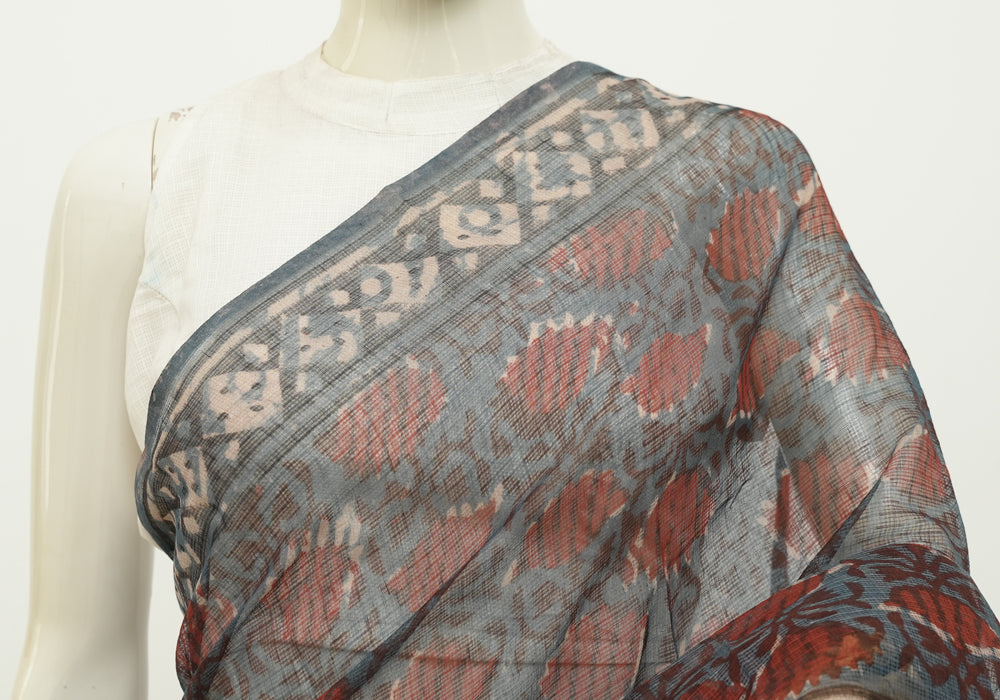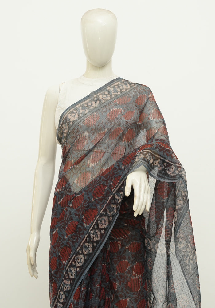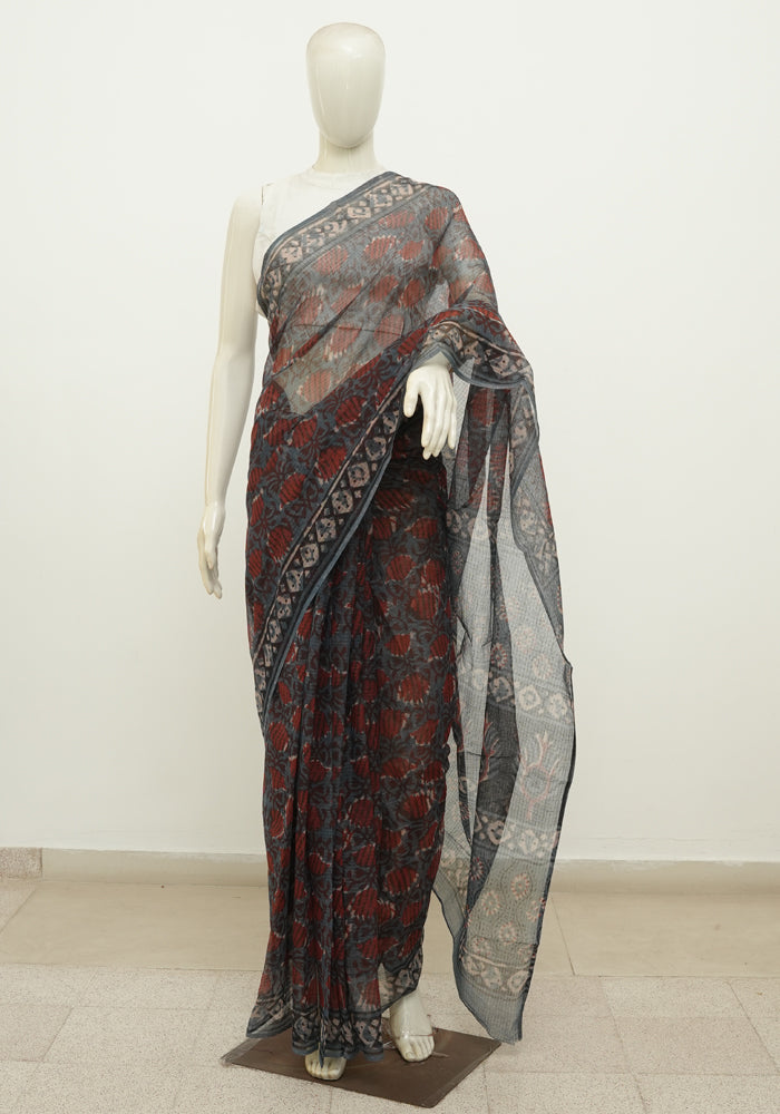 Blue and Red Block Printed Kota Saree