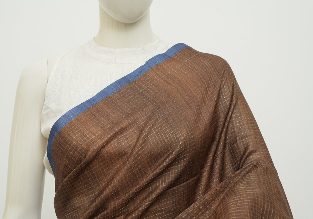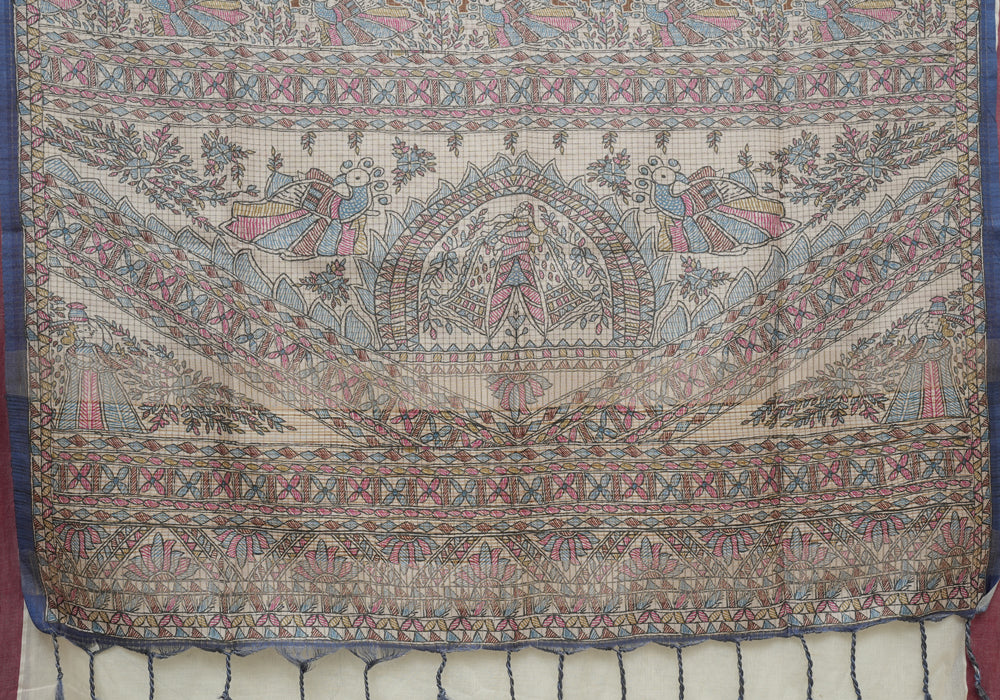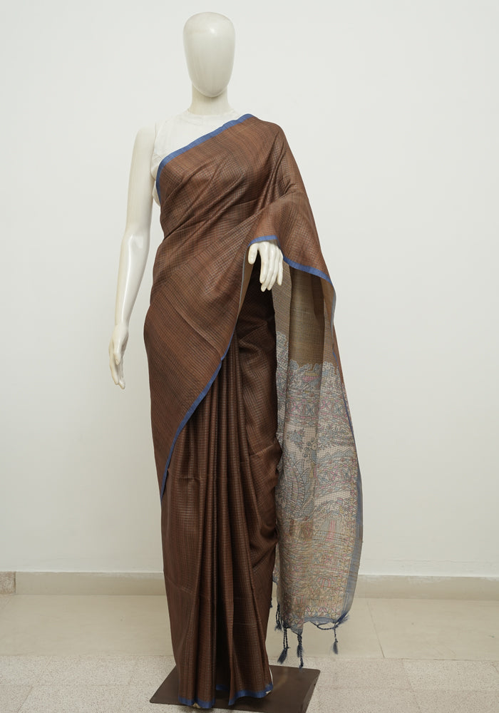 Brown and Blue Madhubani Printed Semi Tussar Saree