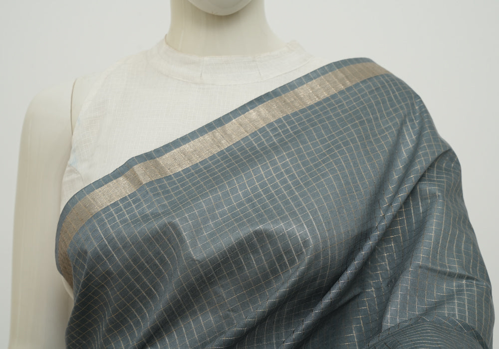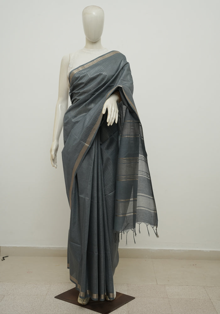 Dark Grey Moonga Semi Tussar Saree With Printed Kalamkari Blouse