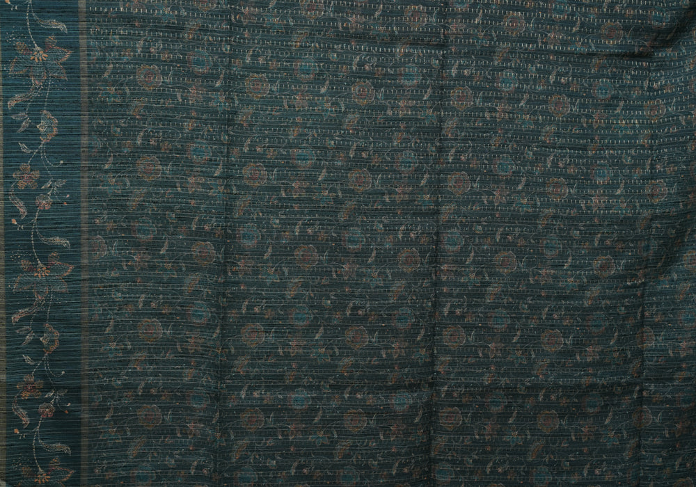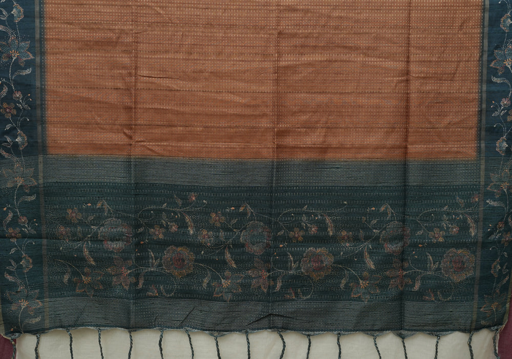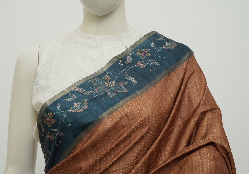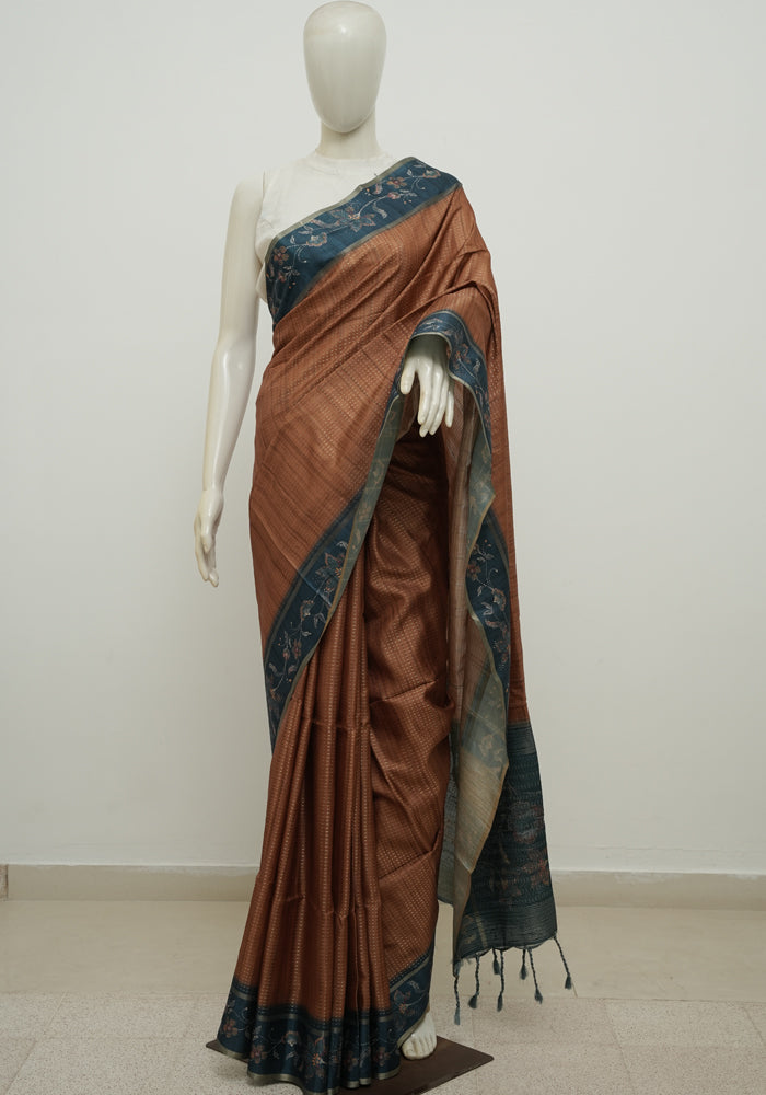 Golden Brown and Peacock Blue Semi Tussar Saree with Kanta Printed Pallu and Blouse is OUT OF STOCK currently and available on pre-payment only. Order now for delivery within 2 weeks.
