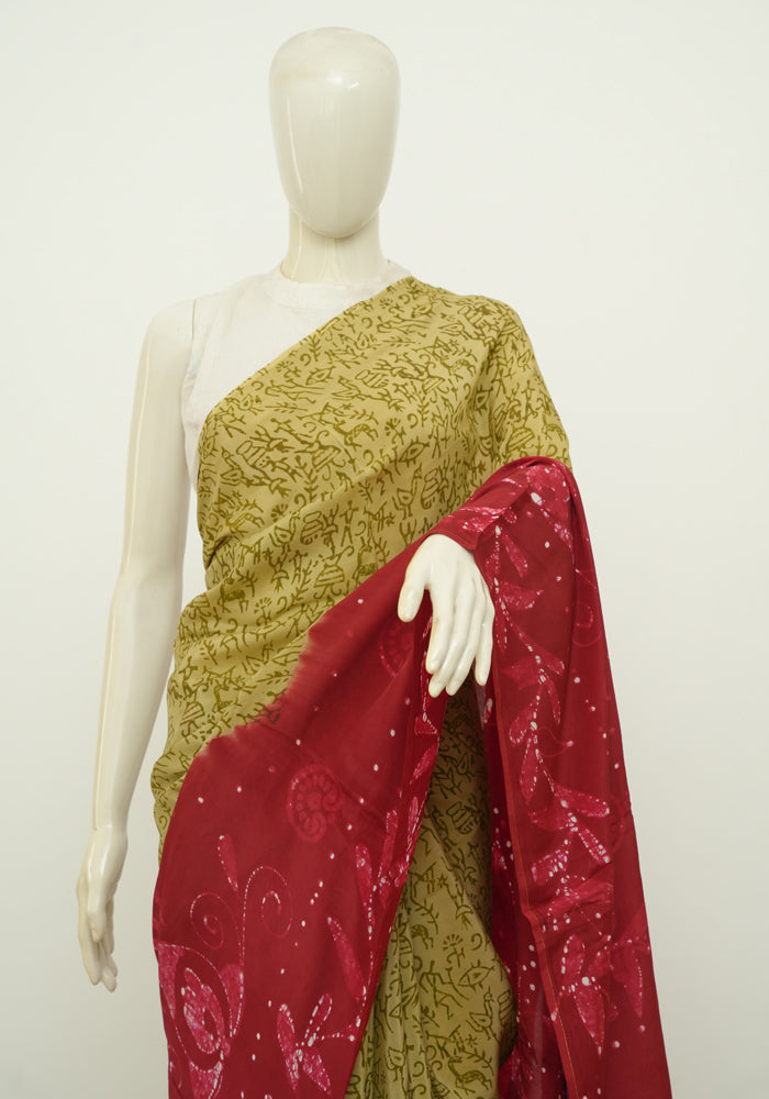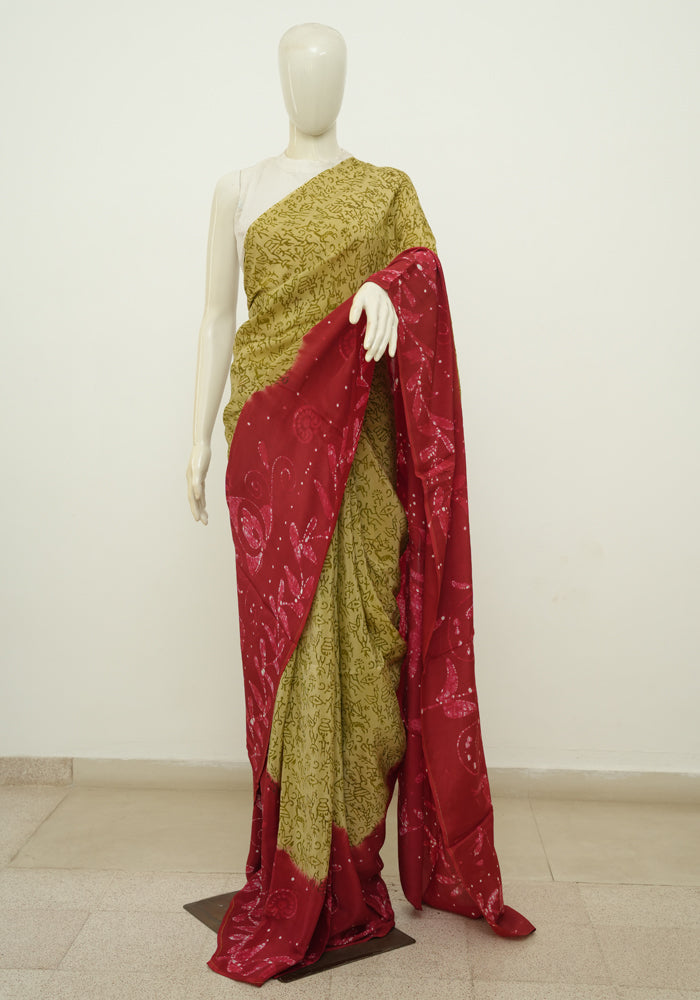 Light Brown and Maroon Batik Crepe Saree