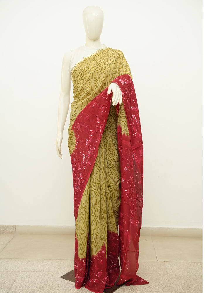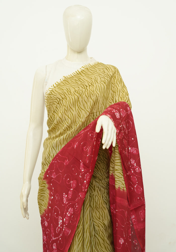 Light Brown and Maroon Batik Crepe Saree is OUT OF STOCK currently and available on pre-payment only. Order now for delivery within 2 weeks.