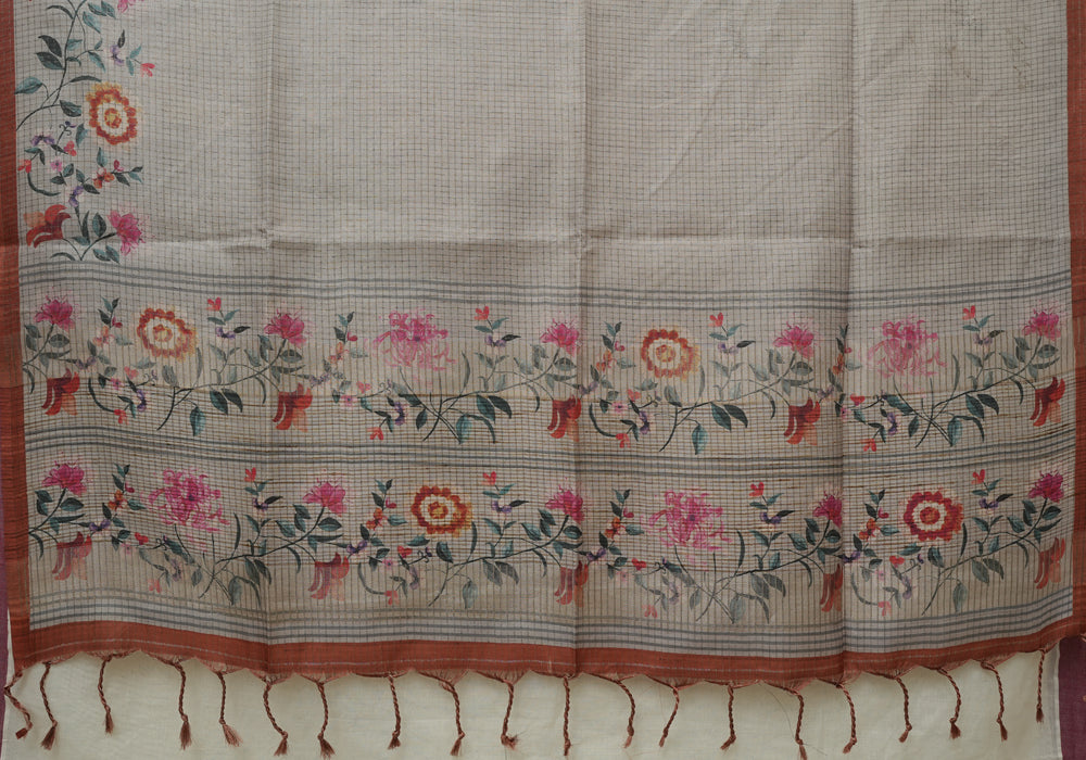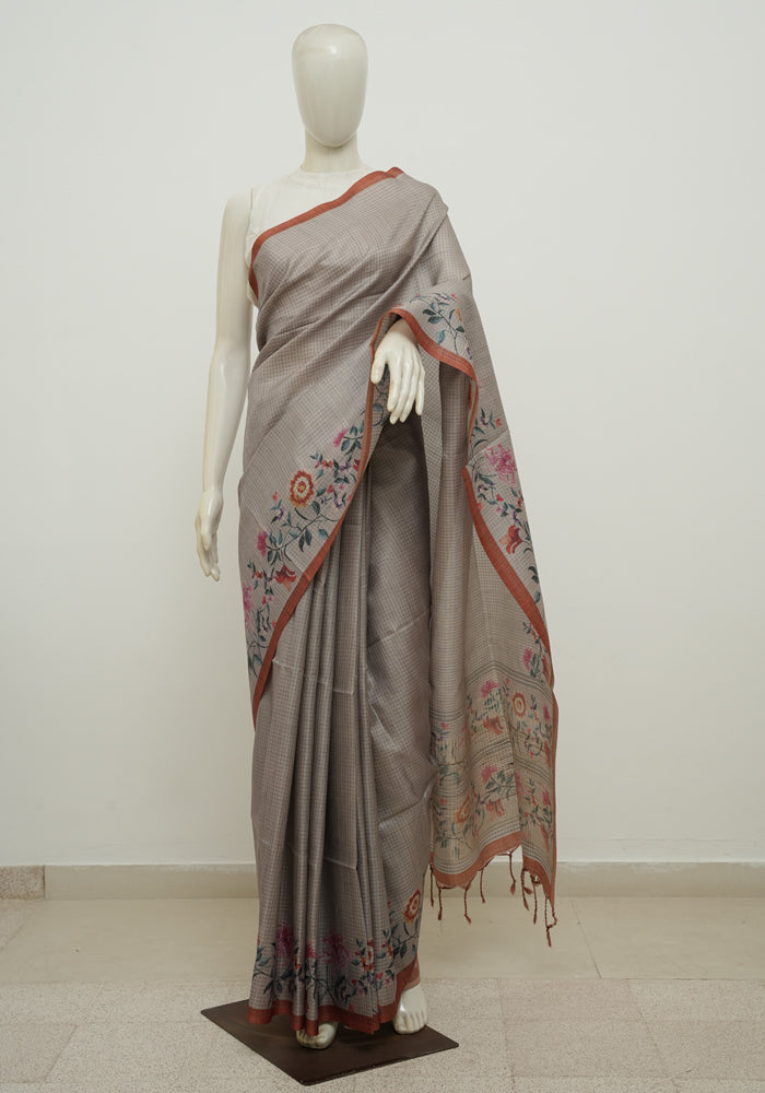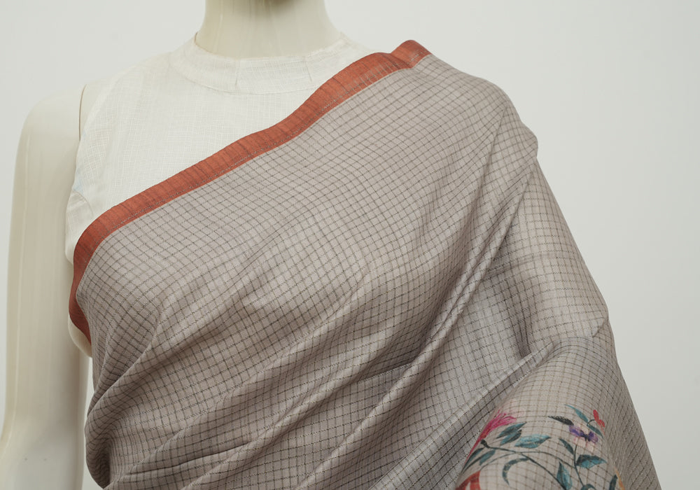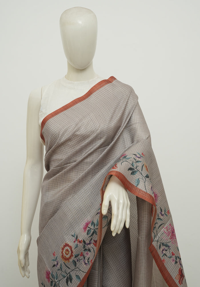 Light Brown and Orange Semi Tussar Saree With Digital Print is OUT OF STOCK currently and available on pre-payment only. Order now for delivery within 2 weeks.