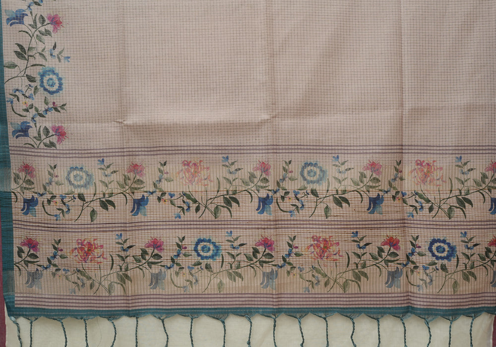 Light Pink and Blue Semi Tussar Saree With Digital Print is OUT OF STOCK currently and available on pre-payment only. Order now for delivery within 2 weeks.