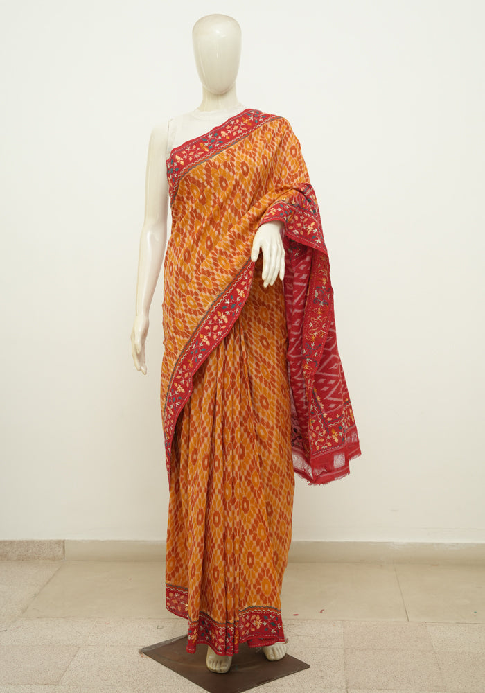Mustard Yellow and Red Ikat Cotton Saree with Hand Embroidery
