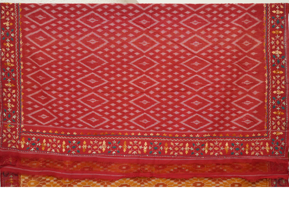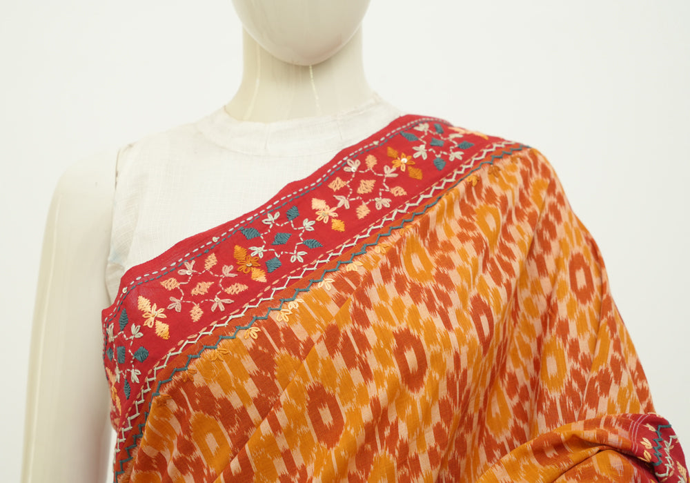Mustard Yellow and Red Ikat Cotton Saree with Hand Embroidery is OUT OF STOCK currently and available on pre-payment only. Order now for delivery within 2 weeks.