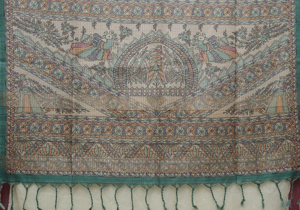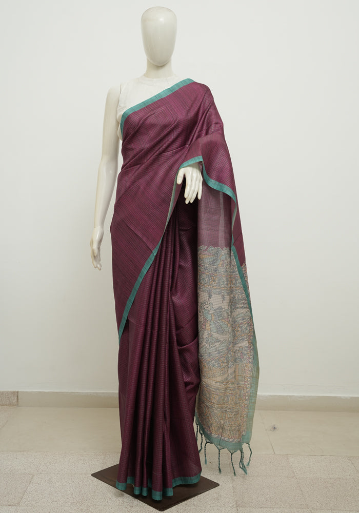 Purple and Green Madhubani Printed Semi Tussar Saree is OUT OF STOCK currently and available on pre-payment only. Order now for delivery within 2 weeks.