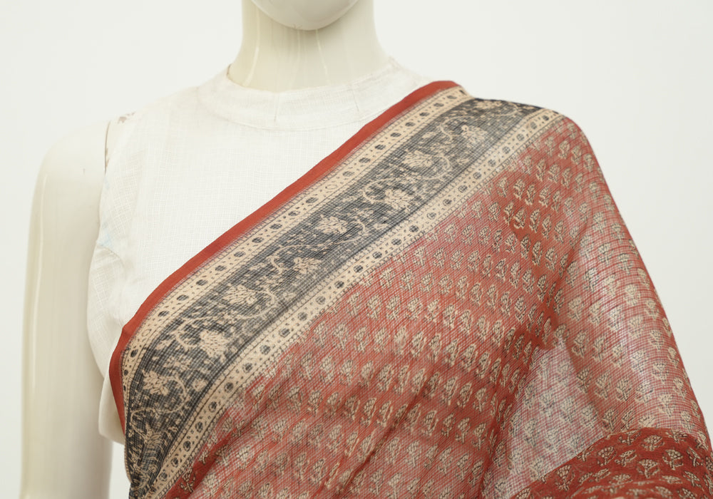 Red Block Printed Kota Saree is OUT OF STOCK currently and available on pre-payment only. Order now for delivery within 2 weeks.