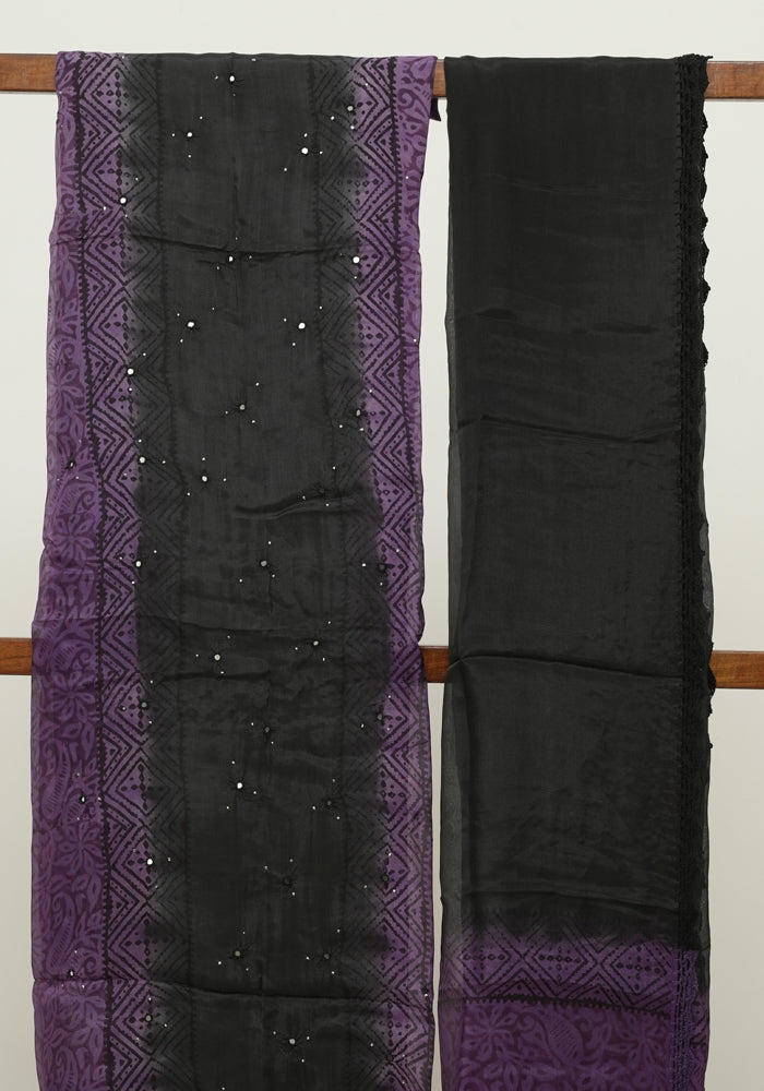 Purple and Black Unstitched Blockprinted Semi Organza Salwar Set With Crochet Dupatta