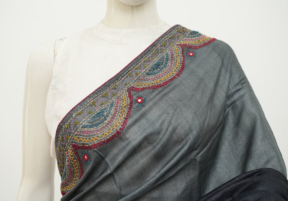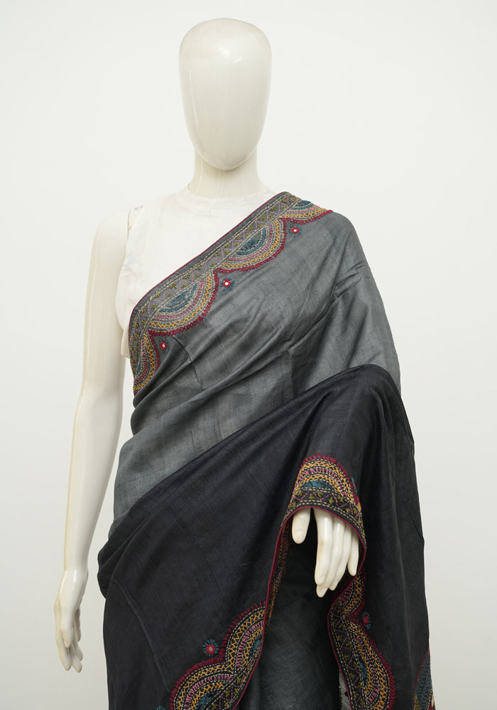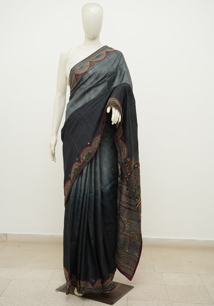 Grey and Black Tussar Silk Saree with Lambani Embroidery