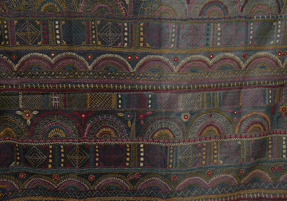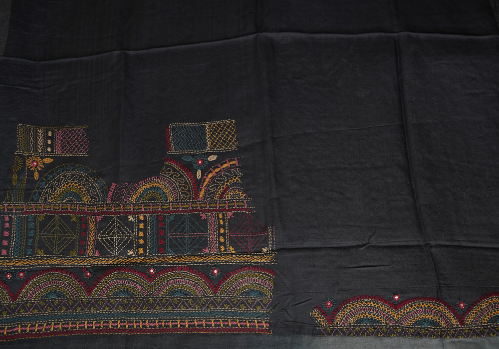 Grey and Black Tussar Silk Saree with Lambani Embroidery is OUT OF STOCK currently and available on pre-payment only. Order now for delivery within 2 weeks.