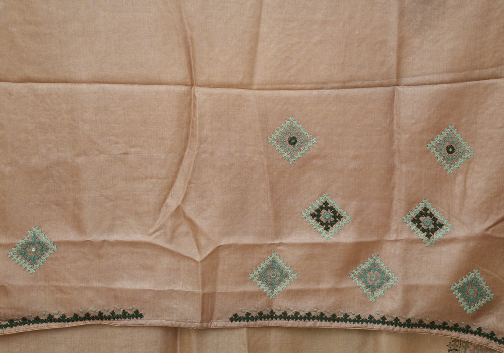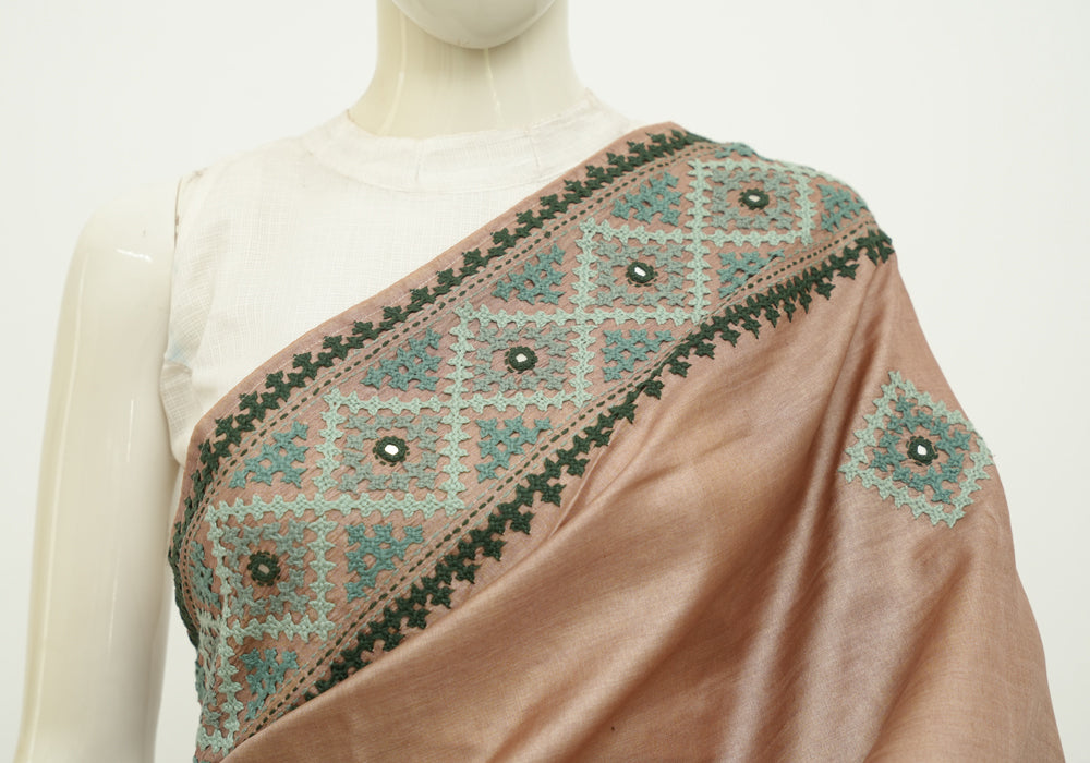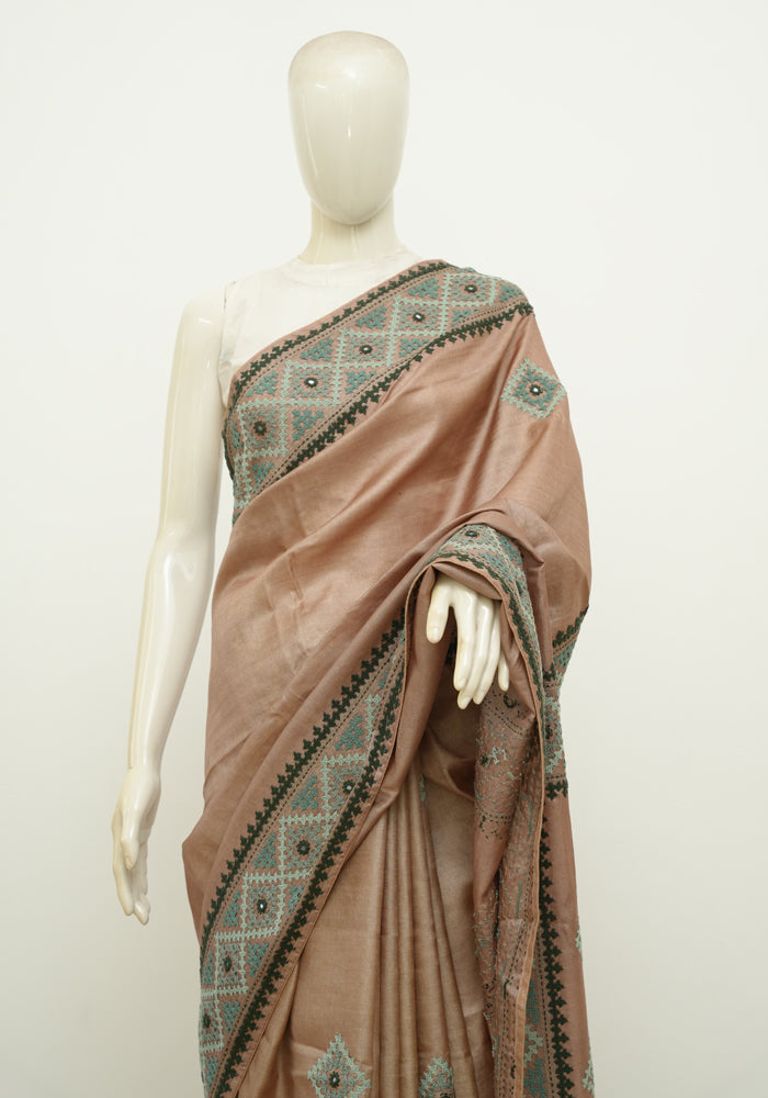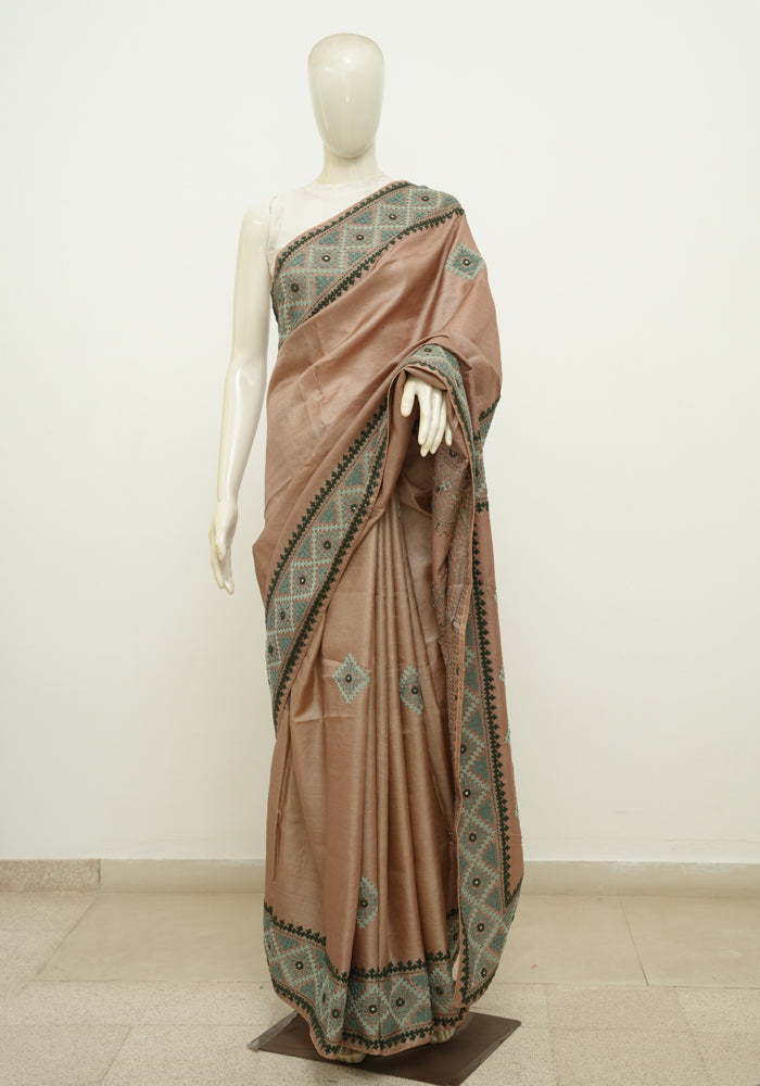 Light Brown Tussar Silk Saree with Kutch and Mirror work