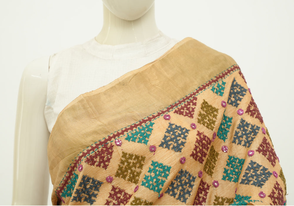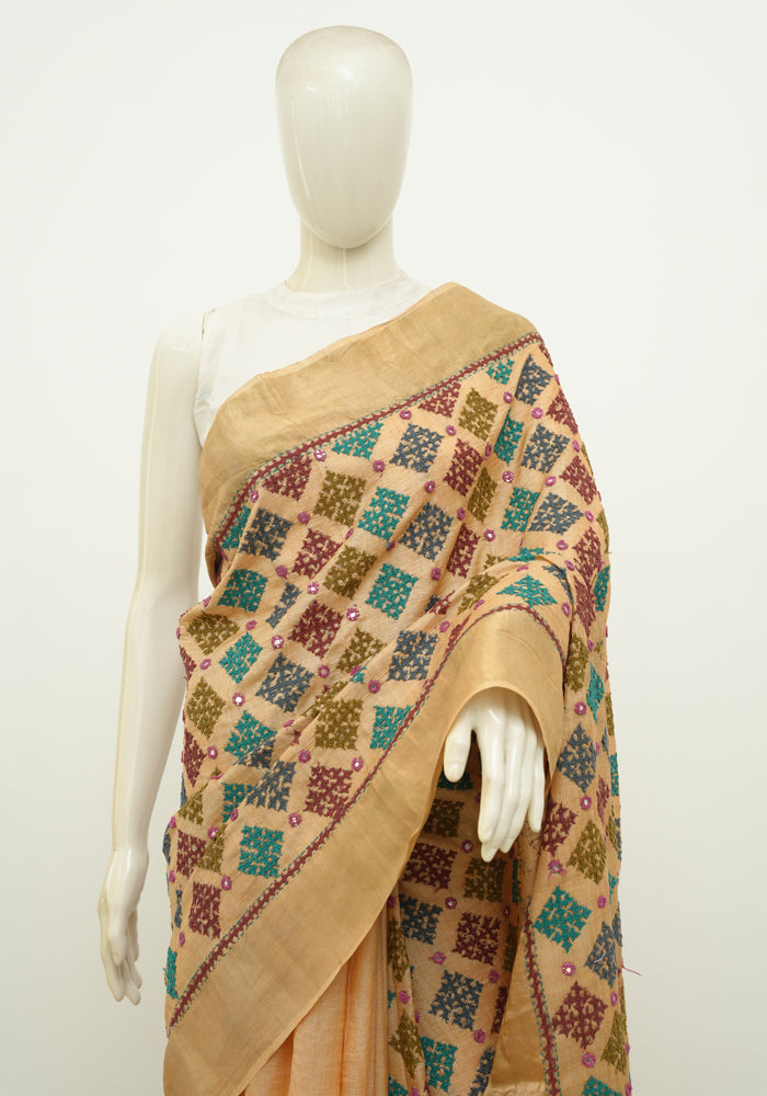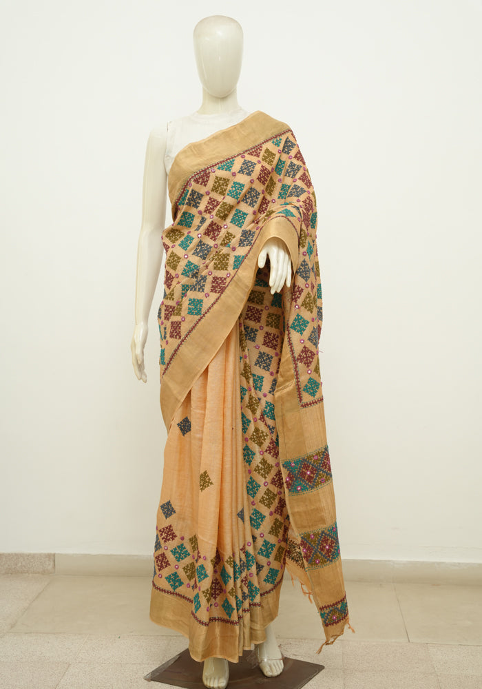 Light Brown Tussar Silk Saree with Kutch and Mirror work
