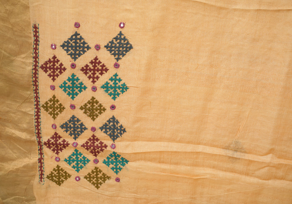 Light Brown Tussar Silk Saree with Kutch and Mirror work is OUT OF STOCK currently and available on pre-payment only. Order now for delivery within 2 weeks.