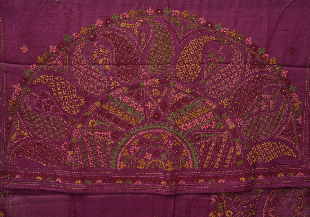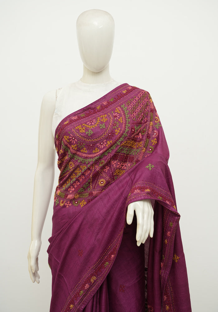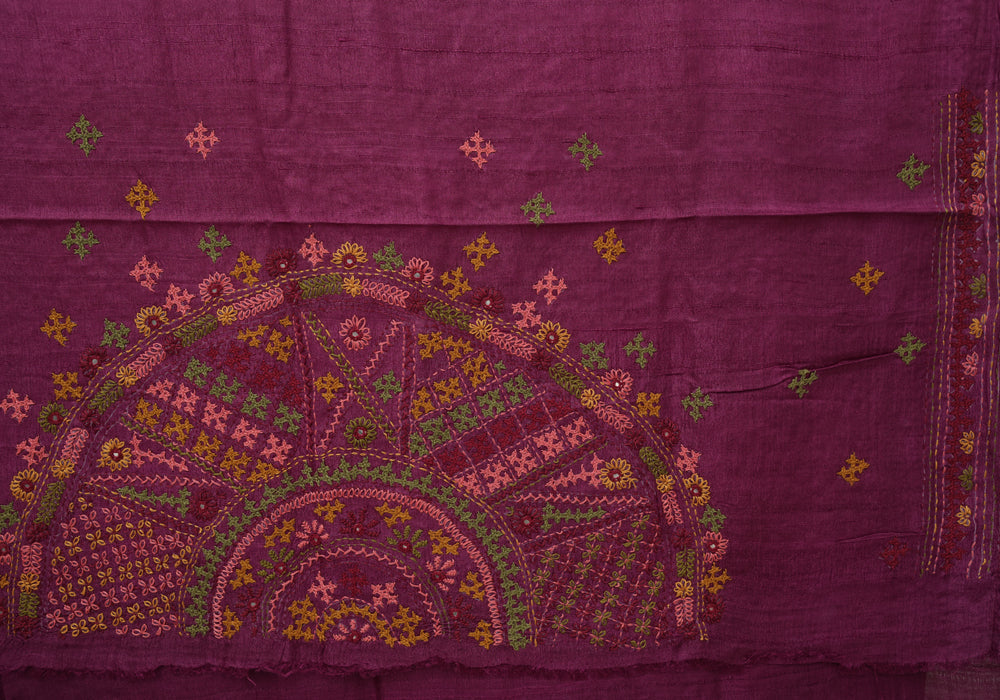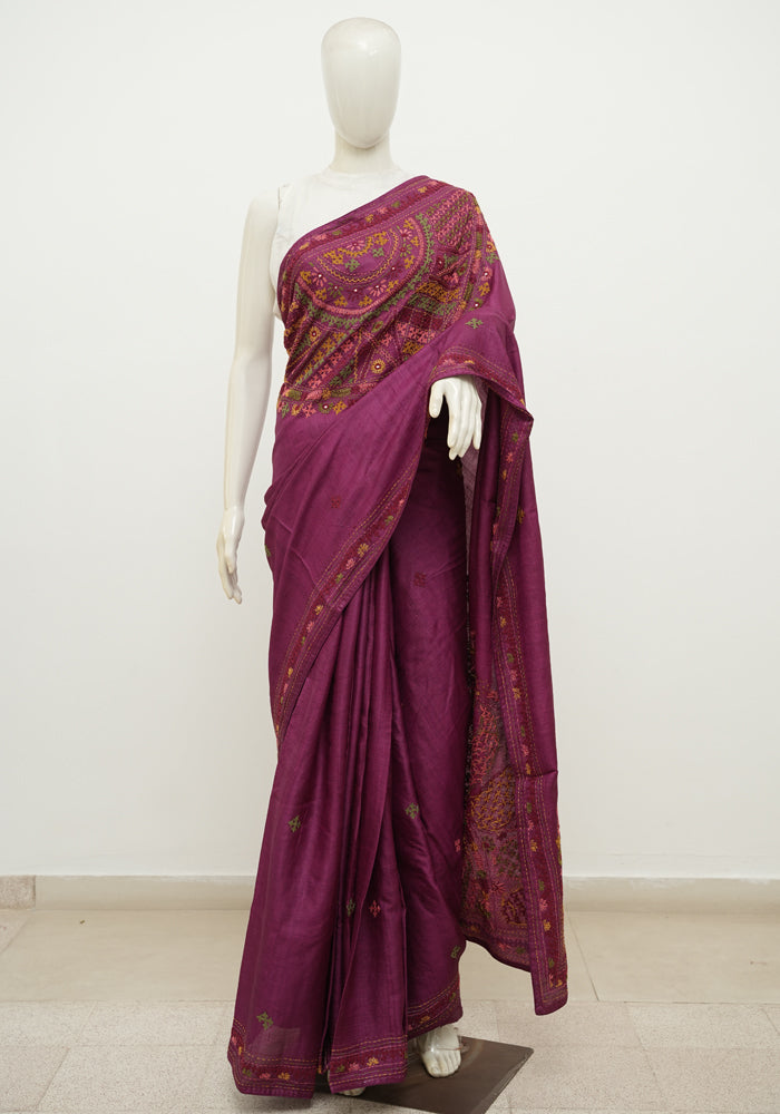 Magenta Tussar Silk Saree with Lambani Embroidery