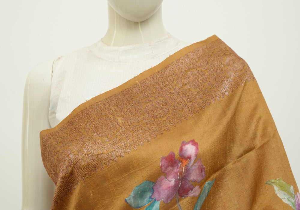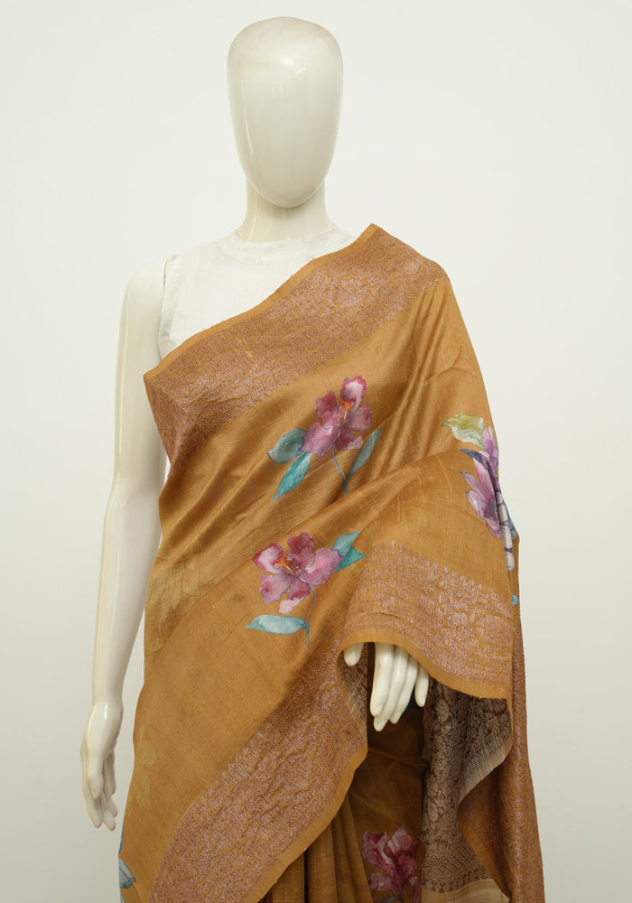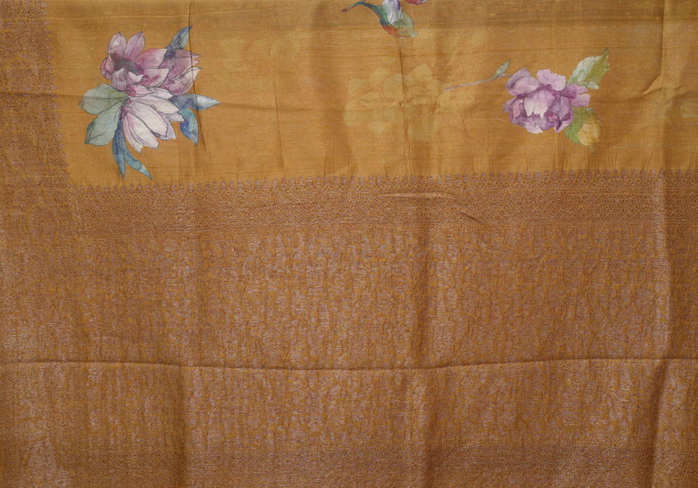 Mustard Yellow Tussar Benarasi Saree With Digital Print is OUT OF STOCK currently and available on pre-payment only. Order now for delivery within 2 weeks.