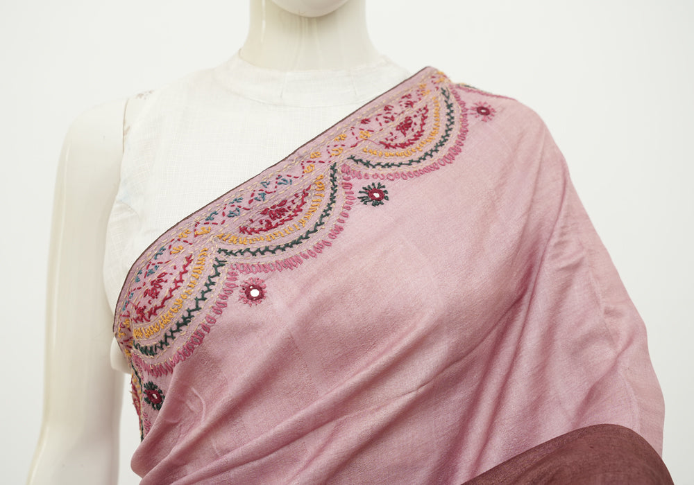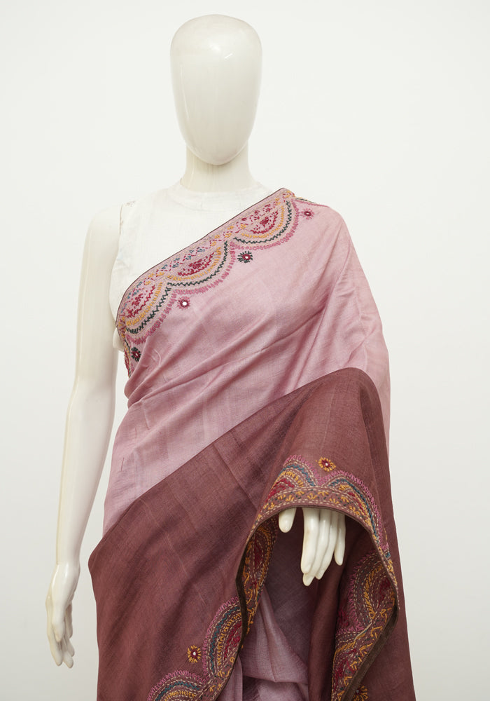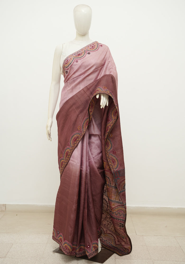 Onion Pink and Brown Tussar Silk Saree with Lambani Embroidery