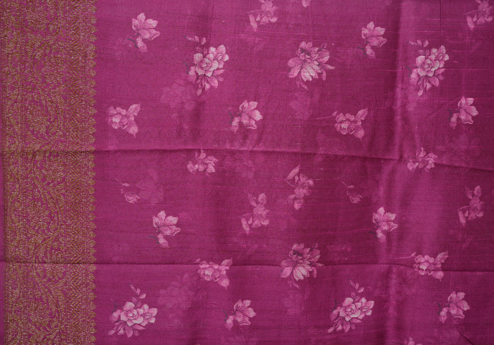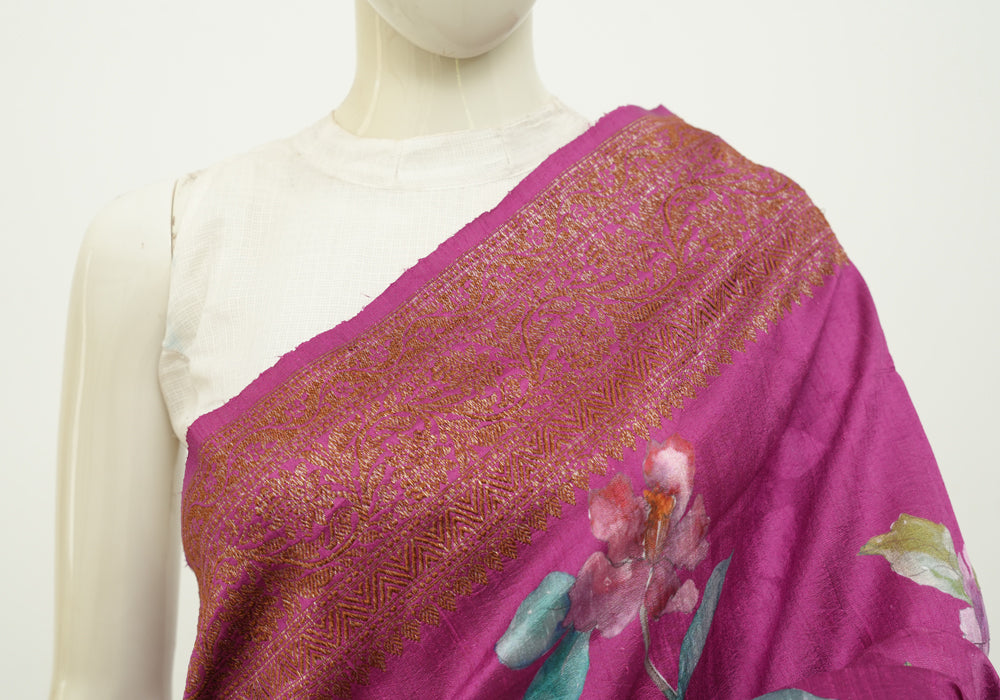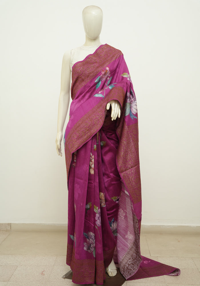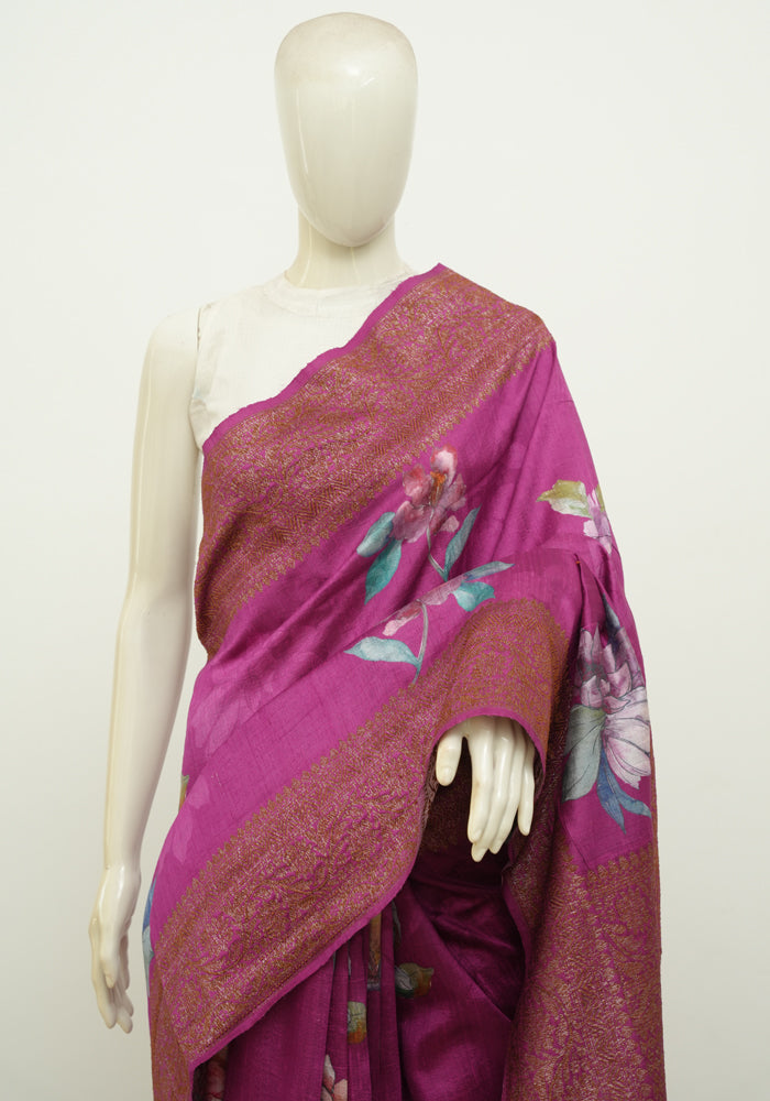 Pink Tussar Benarasi Saree With Digital Print is OUT OF STOCK currently and available on pre-payment only. Order now for delivery within 2 weeks.