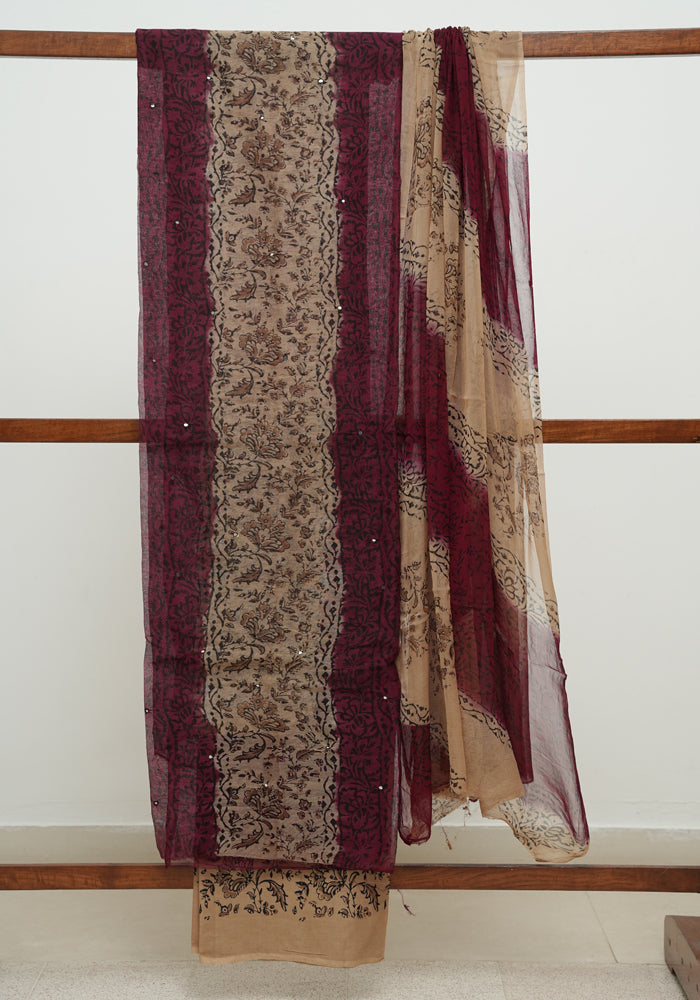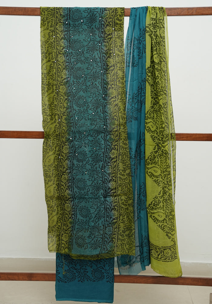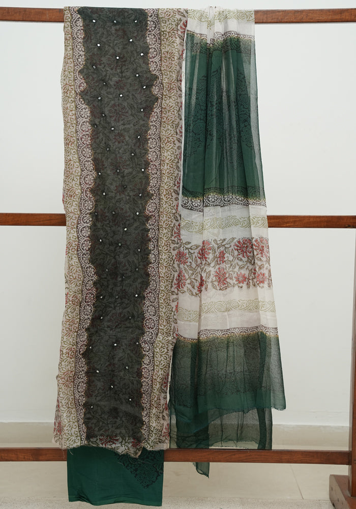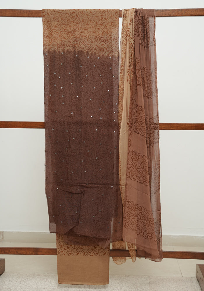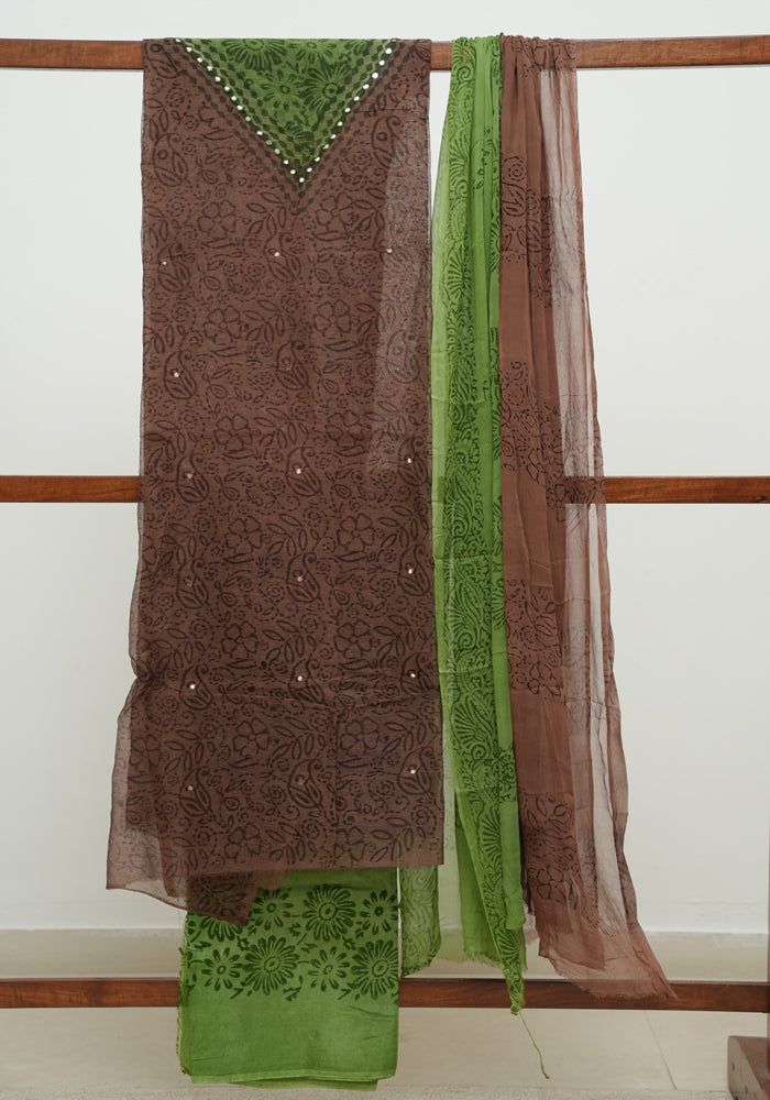 Brown and Green Block Printed Tepchi Kota Unstitched Salwar Set With Mirror Work