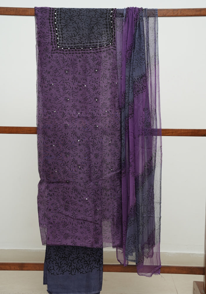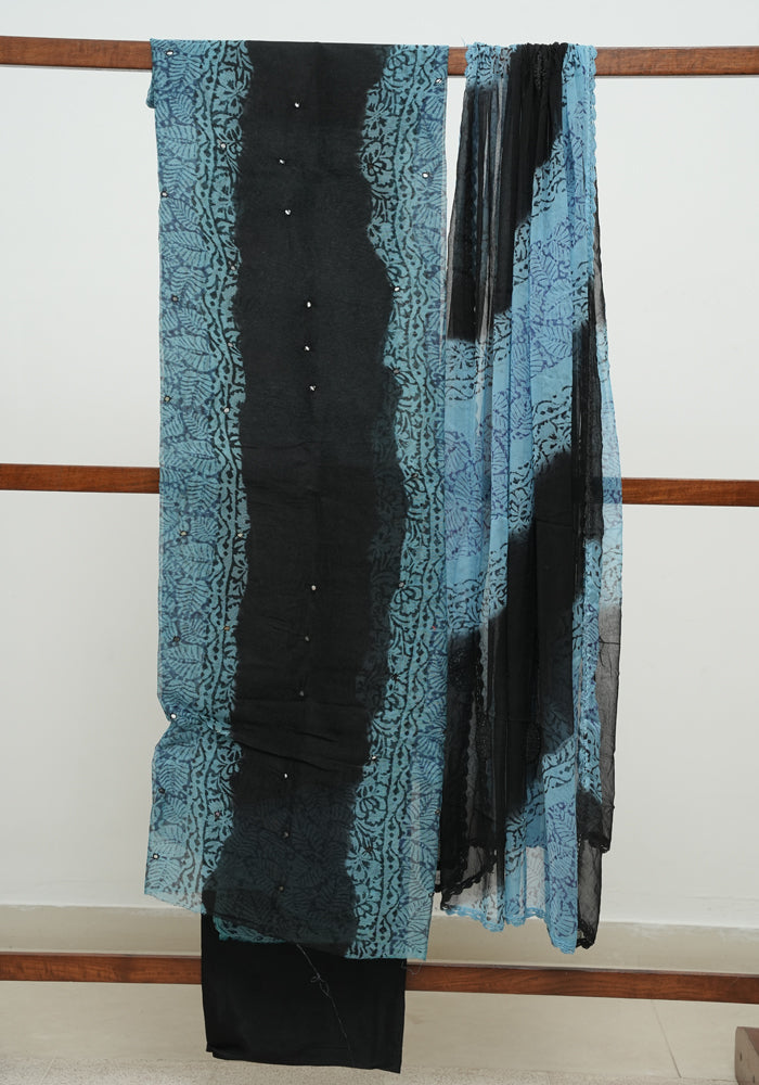 White and Blue Block Printed Tepchi Kota Unstitched Salwar Set With Mirror Work